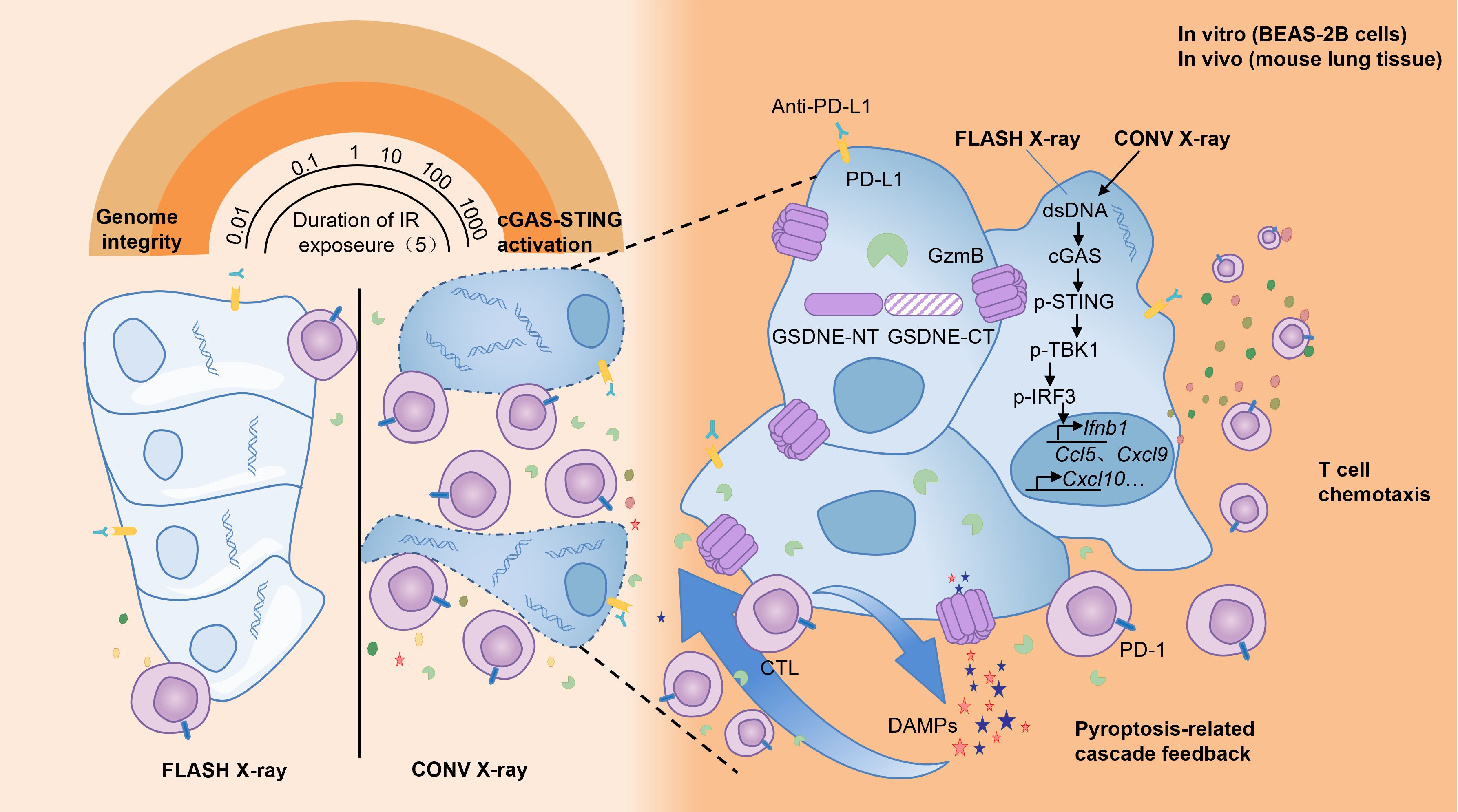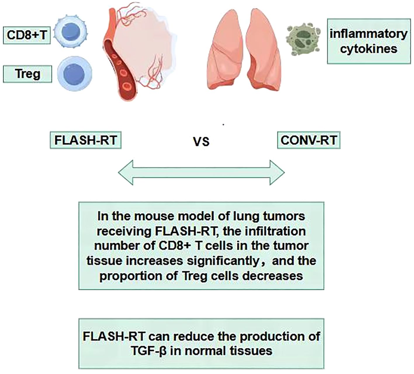 Regarding the immunological hypothesis, there are currently also some studies with negative results (109, 110). Moreover, there are still many unknowns and questions that require further investigation. For instance, the exact molecular mechanisms of immunomodulation by FLASH-RT and the specific roles of different immune cell subsets in protecting against lung injury. In the future, more in-depth basic research and large-scale clinical studies are needed to further verify and improve this hypothesis, providing a solid theoretical basis for the widespread application of FLASH-RT in lung cancer and other diseases that require thoracic radiotherapy. Nevertheless, not all studies have observed consistent immune responses to FLASH. Some preclinical experiments report minimal activation of innate or adaptive immunity, suggesting possible dose-dependency or tumor-type specificity (111). Furthermore, the paradox of lymphocyte sparing versus enhanced CD8+ T-cell infiltration remains unresolved and requires mechanistic clarification. Ongoing trials combining FLASH-RT with immune checkpoint inhibitors may shed light on these immune dynamics.
