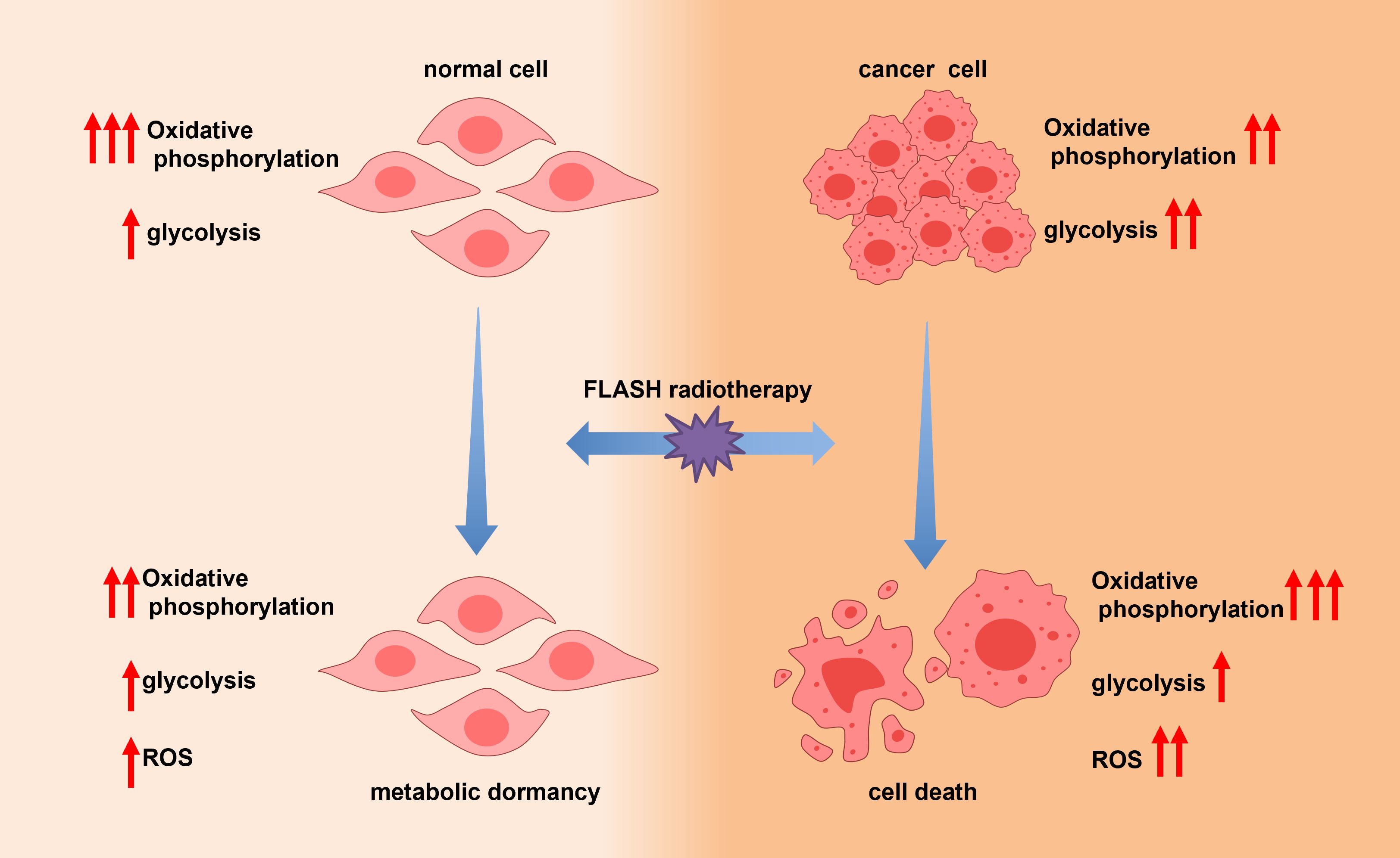 In contrast, FLASH-RT exhibits different metabolic effects (40, 87–89). Emerging evidence suggests that FLASH-RT may preserve mitochondrial integrity and OXPHOS activity in normal cells. Moreover, normal lung cells may enter a state of metabolic quiescence—a transient, energy-conserving condition characterized by suppressed OXPHOS and biosynthetic activity, functionally resembling cellular dormancy. In this state, cells reduce ATP consumption by downregulating non-essential protein synthesis and decreasing the activity of energy-intensive ion pumps, thereby conserving metabolic resources and enhancing resistance to stress. Although real-time measurement of ATP levels and mitochondrial function during FLASH exposure remains technically challenging, preclinical studies support the notion that metabolic quiescence may serve as a protective mechanism against hypoxia, radiation, and other cytotoxic insults. This metabolic adaptation may underlie the observed tissue-sparing effects of FLASH-RT, particularly in highly sensitive organs such as the lungs (Figure 6).