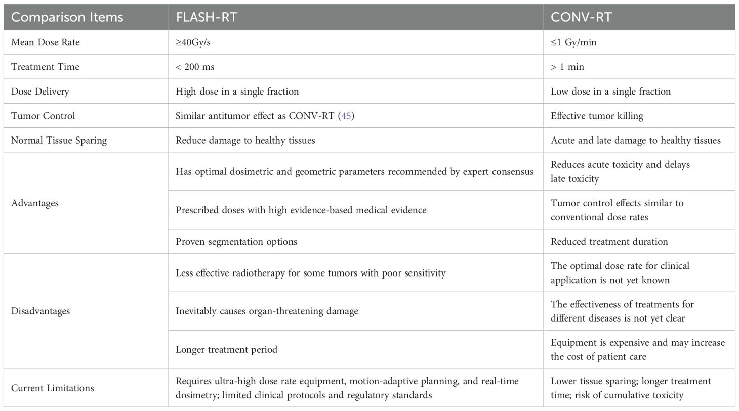 FLASH-RT refers to a radiation therapy modality that utilizes ultra-high dose rate (UHDR) irradiation (>40 Gy/s, compared to CONV-RT dose rates typically <0.17 Gy/s) delivered within extremely short timeframes (generally <1 second) (26). FLASH-RT is a disruptive new technology in tumor radiotherapy, which is regarded as a significant technological advancement influencing tumor treatment and is one of the most popular research areas in radiotherapy in recent years. Compared with conventional dose rate radiotherapy, FLASH-RT has two major advantages: ①The treatment schedule can be significantly shortened, from several weeks (conventional fractionation) to only a few fractions, with each fraction delivered within milliseconds;②The enhanced sparing of normal tissues, which gives rise to the FLASH effect, is thought to result from a combination of mechanisms, including altered redox chemistry, transient hypoxia, preservation of DNA integrity, and modulation of immune and inflammatory responses. Moreover, by precisely decreasing the volume of the radiotherapy target area, the damage of radiation to adjacent critical structures can be minimized. What’s more, compared with CONV-RT, FLASH-RT has the same lethality to tumor tissues. Simply put, preclinical studies demonstrate that FLASH-RT preserves equivalent tumor control probability (TCP) compared to CONV-RT while significantly lowering normal tissue complication probability (NTCP), particularly in radiosensitive organs such as pulmonary tissues. This paradigm-shifting technology holds promise for optimizing the therapeutic ratio by simultaneously improving treatment efficiency, maintaining oncological efficacy, and mitigating radiation-related toxicities (27–31).