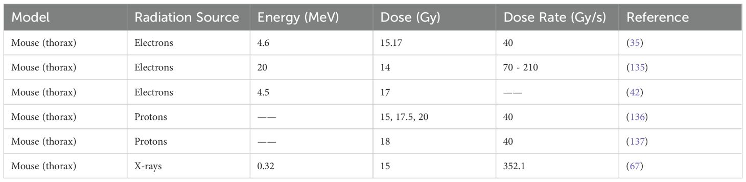 For proton FLASH dosimetry, the Bragg peak profile and depth-dependent energy deposition require specialized techniques (115, 123–126). Monte Carlo simulations are often used to accurately predict the dose distribution in proton FLASH treatments (127–130). Complementing simulations, diamond detectors are increasingly investigated for their nanosecond-scale response, tissue equivalence, and radiation hardness, making them ideal for UHDR dose monitoring in proton beams (131–134). These detectors offer potential for integration into real-time feedback dosimetry systems, though clinical translation will require harmonized calibration standards and validation protocols. The summary of FLASH-RT in the thorax experiments was concluded in Table 2.