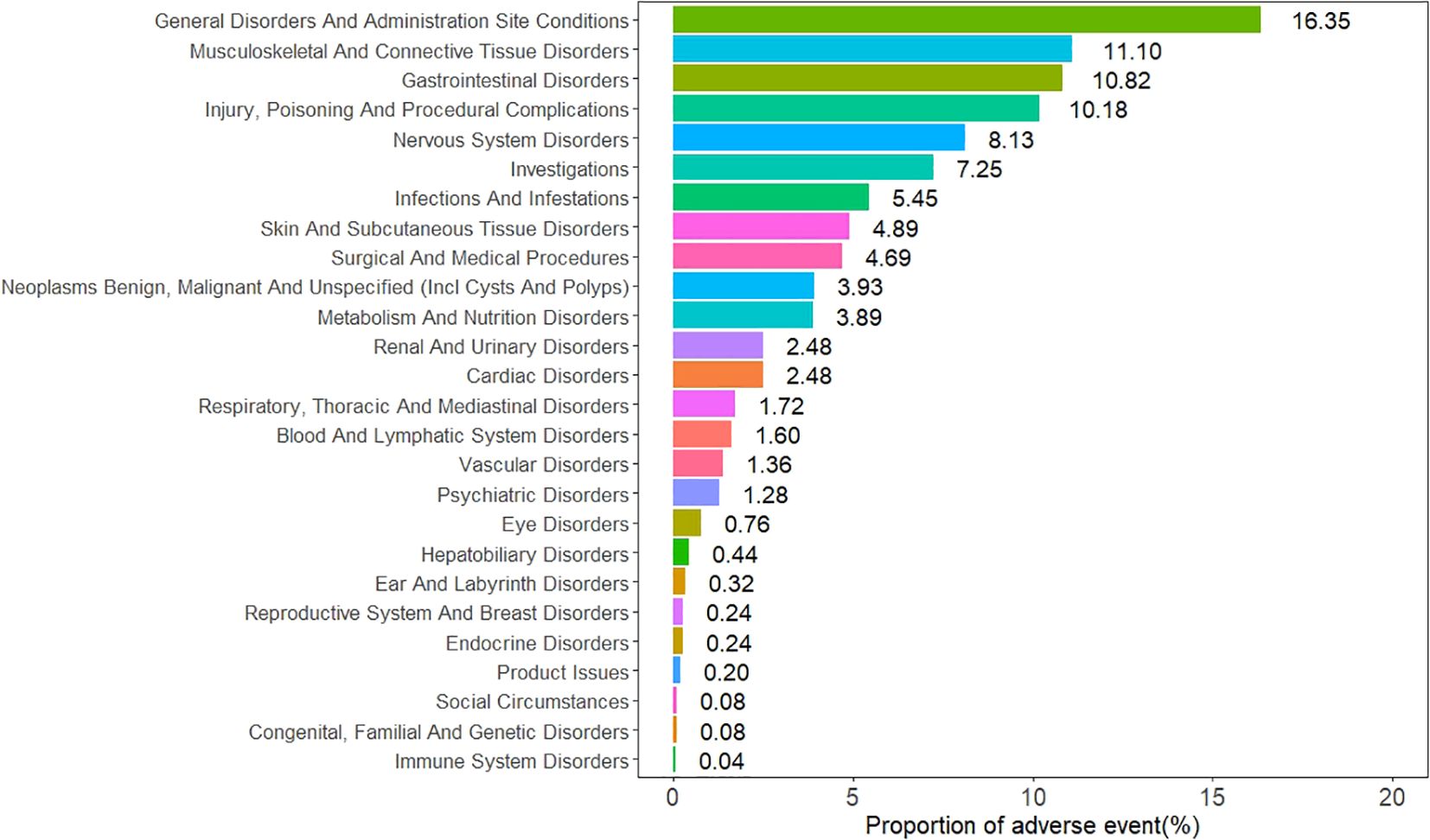To explore temporal trends, the observation period (2015–2024) was divided into two phases: the first 5 years (2015–2019) and the later 5 years (2020–2024). Based on the MedDRA classification system, AEs were analyzed at both the SOC and PT levels, and frequency distributions between the two periods were compared.