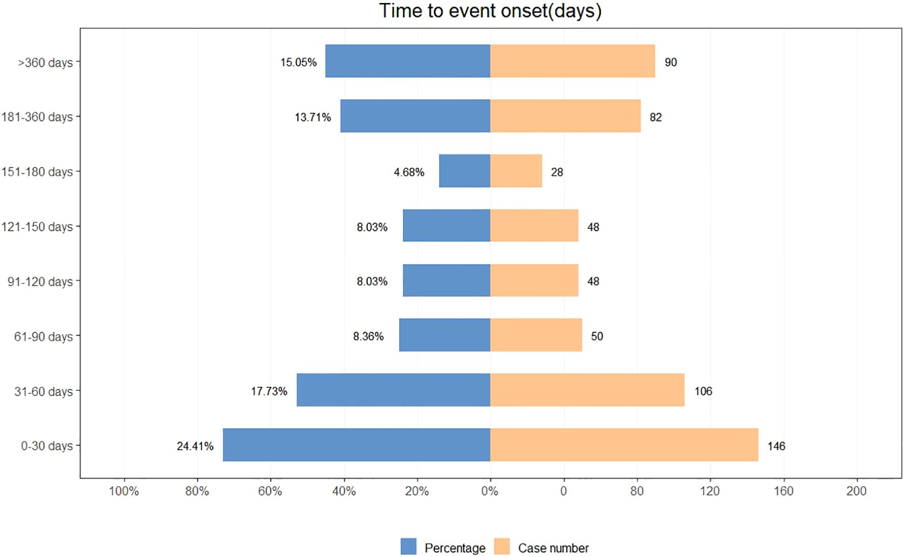 A total of 598 reports provided detailed information on the TTO of AEs, with their distribution shown in Figure 3. Approximately 24.4% of AEs occurred within the first month after treatment initiation, and the median TTO was 88 days. The cumulative distribution of these onset times is illustrated in Figure 4. In addition, a Weibull distribution analysis was performed on the TTO data for sonidegib-related AEs. The results indicated an early failure model, as presented in Table 4.