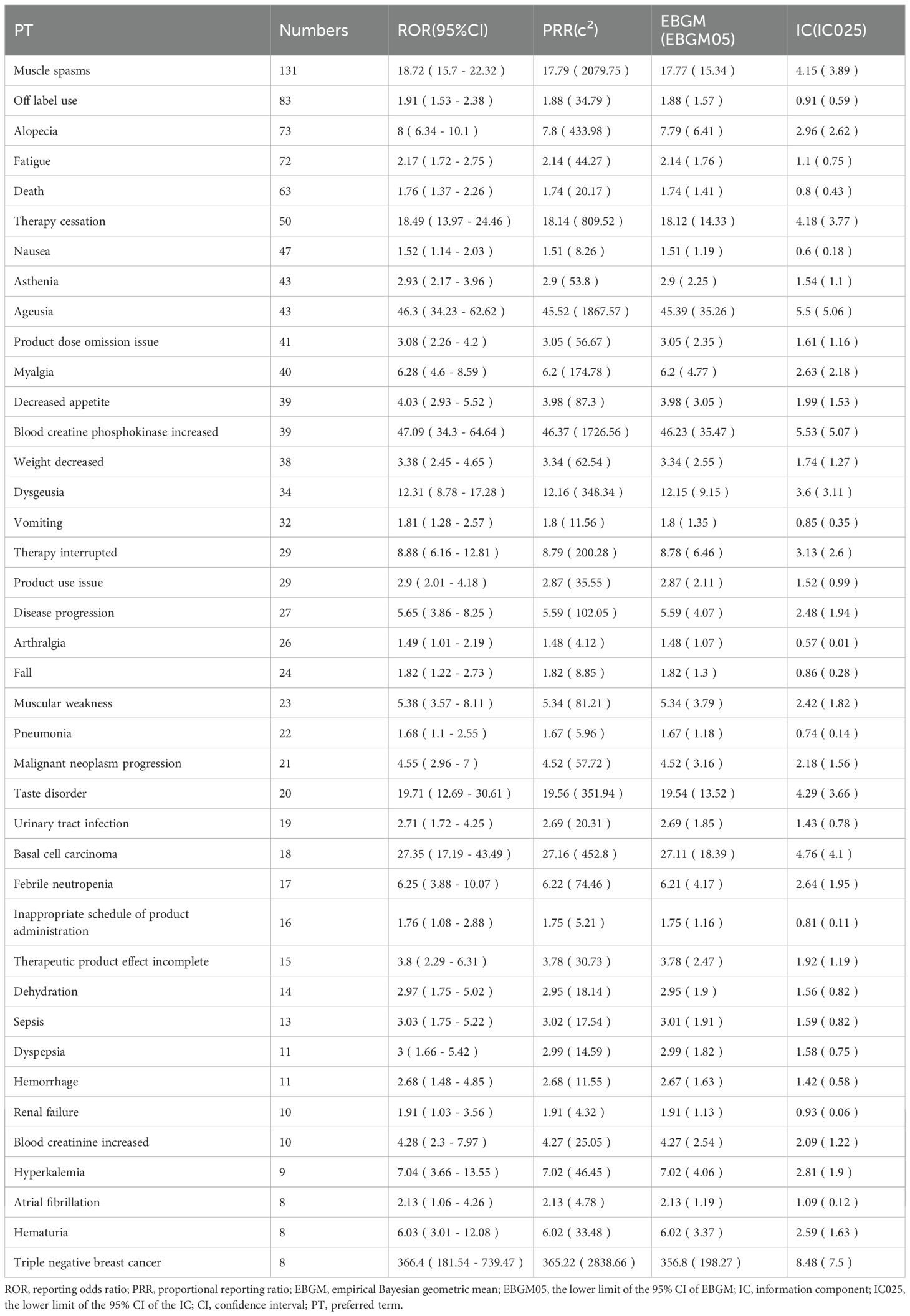 Table 3 presents the top 40 positive AEs ranked by reporting frequency. The most common AEs include muscle spasms, alopecia, fatigue, nausea, dysgeusia, diarrhea, and decreased appetite. This study confirmed several known AEs, such as muscle spasms, myalgia, alopecia, fatigue, nausea, vomiting, and decreased appetite. In addition, several unexpected AEs were identified, including pneumonia, sepsis, urinary tract infection, renal failure, arthralgia, muscular weakness, dehydration, dyspepsia, hyperkalemia, atrial fibrillation(AF) and fall.
