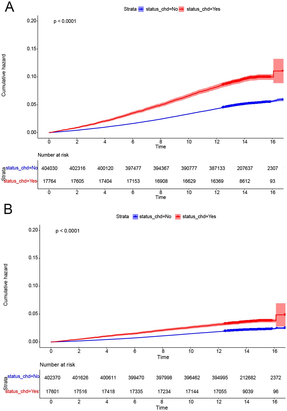 Cumulative occurrence curves clearly illustrated the influence of CHD on the incidence of CRPs. Figure 1 demonstrates that patients with CHD experienced a markedly higher cumulative hazard of developing CRPs in comparison to those without CHD (P < 0.001). A subsequent subgroup analysis (Table 3, Supplementary Table 2) revealed that across different income groups, CHD patients displayed an elevated risk of CRP onset. In alignment with the findings of the cross-sectional analysis, higher income levels were linked to a diminished risk of CRP development in both CHD and non-CHD patients, as evidenced by decreasing hazard ratios (HR) corresponding to increasing income levels (P < 0.001). Additionally, the cumulative occurrence curves indicated that elevated income levels effectively mitigated the onset of CRPs (Figures 2A, 3A).