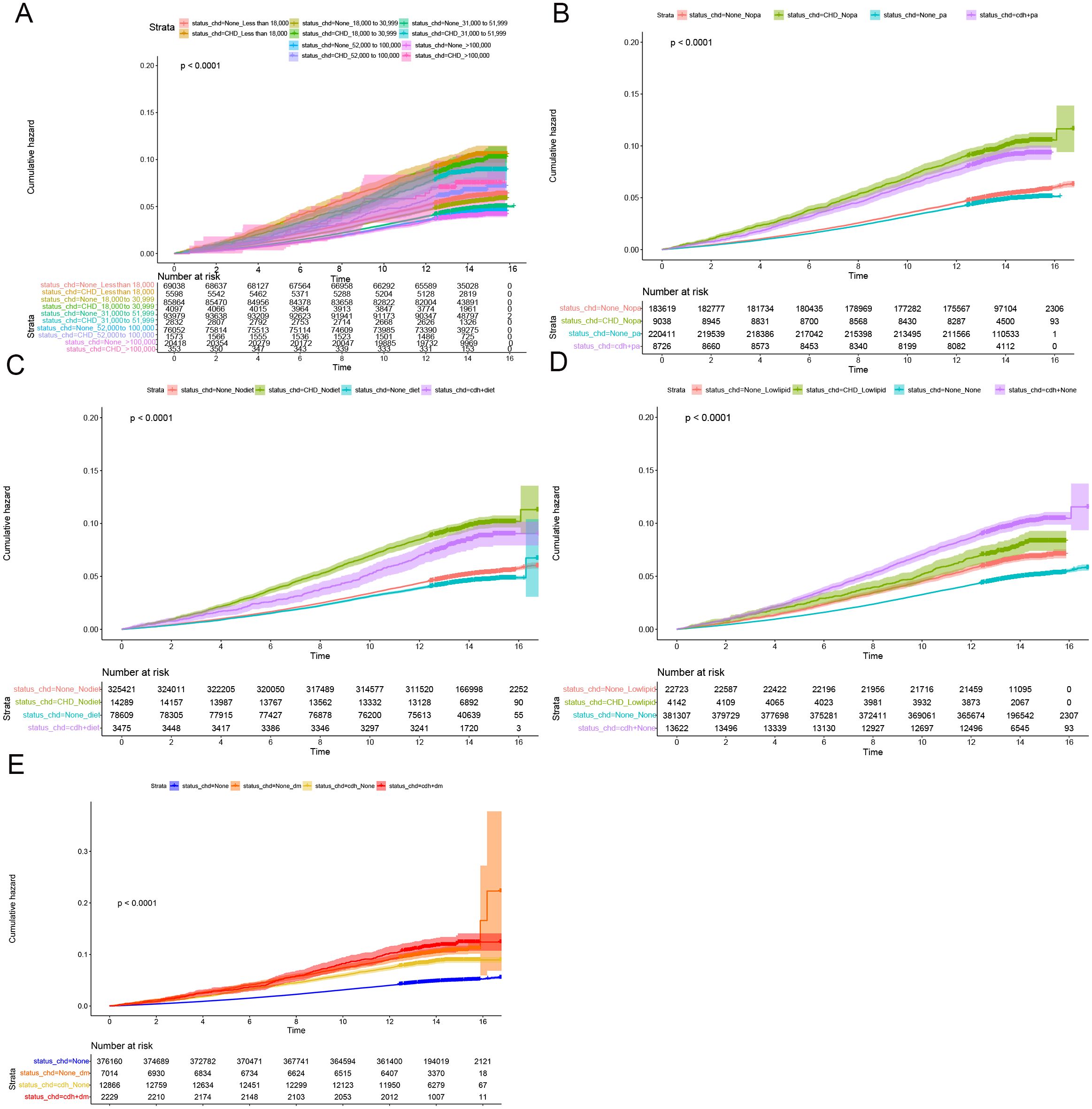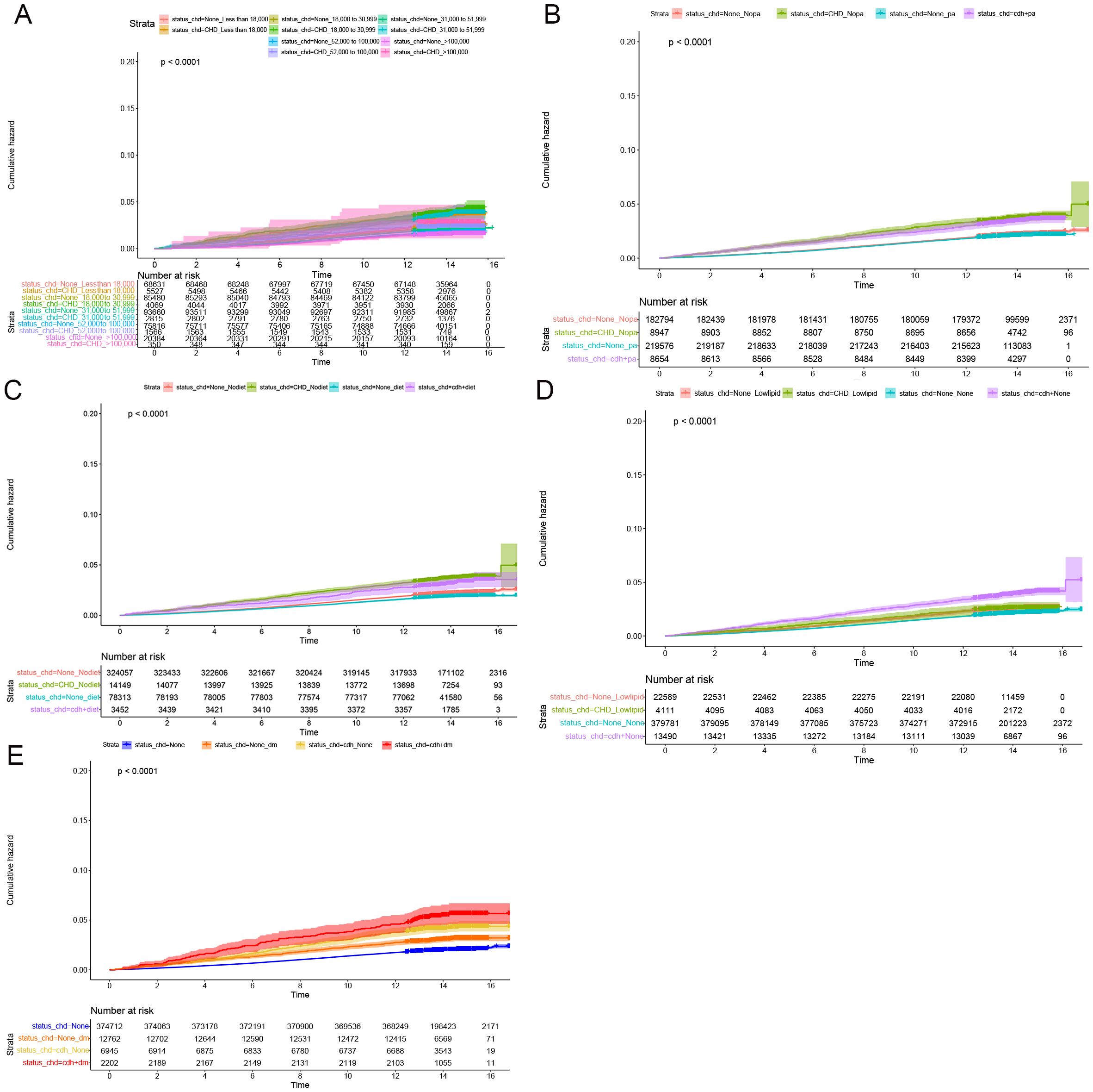 Figure 3. Subgroup longitudinal analysis to assess the association of CHD with rectal polyps. (A) Grouping from top to bottom: patients with an income of less than 18000 and without CHD, patients with an income of less than 18000 and with CHD, patients with an income of 18000 to 30999 and without CHD, patients with an income of 18000 to 30999 and with CHD, patients with an income of 31000 to 51999 and without CHD, patients with an income of 31000 to 51999 and with CHD, patients with an income of 52000 to 100000 and without CHD, patients with an income of 52000 to 100000 and with CHD, patients with an income of > 100000 and without CHD, patients with an income of > 100000 and with CHD. (B) Grouping from top to bottom: patients without physical activity and without CHD, patients without physical activity and with CHD, patients with physical activity and without CHD, patients with physical activity and with CHD. (C) Grouping from top to bottom: patients without healthy diet and without CHD, patients without healthy diet and with CHD, patients without healthy diet and with CHD, patients with healthy diet and with CHD. (D) Grouping from top to bottom: patients with lowering lipid medication and without CHD, patients with lowering lipid medication and with CHD, patients without lowering lipid medication and without CHD, patients without lowering lipid medication and with CHD. (E) Grouping from top to bottom: patients without DM and without CHD, patients without DM and with CHD, patients with DM and with CHD, patients with DM and with CHD.