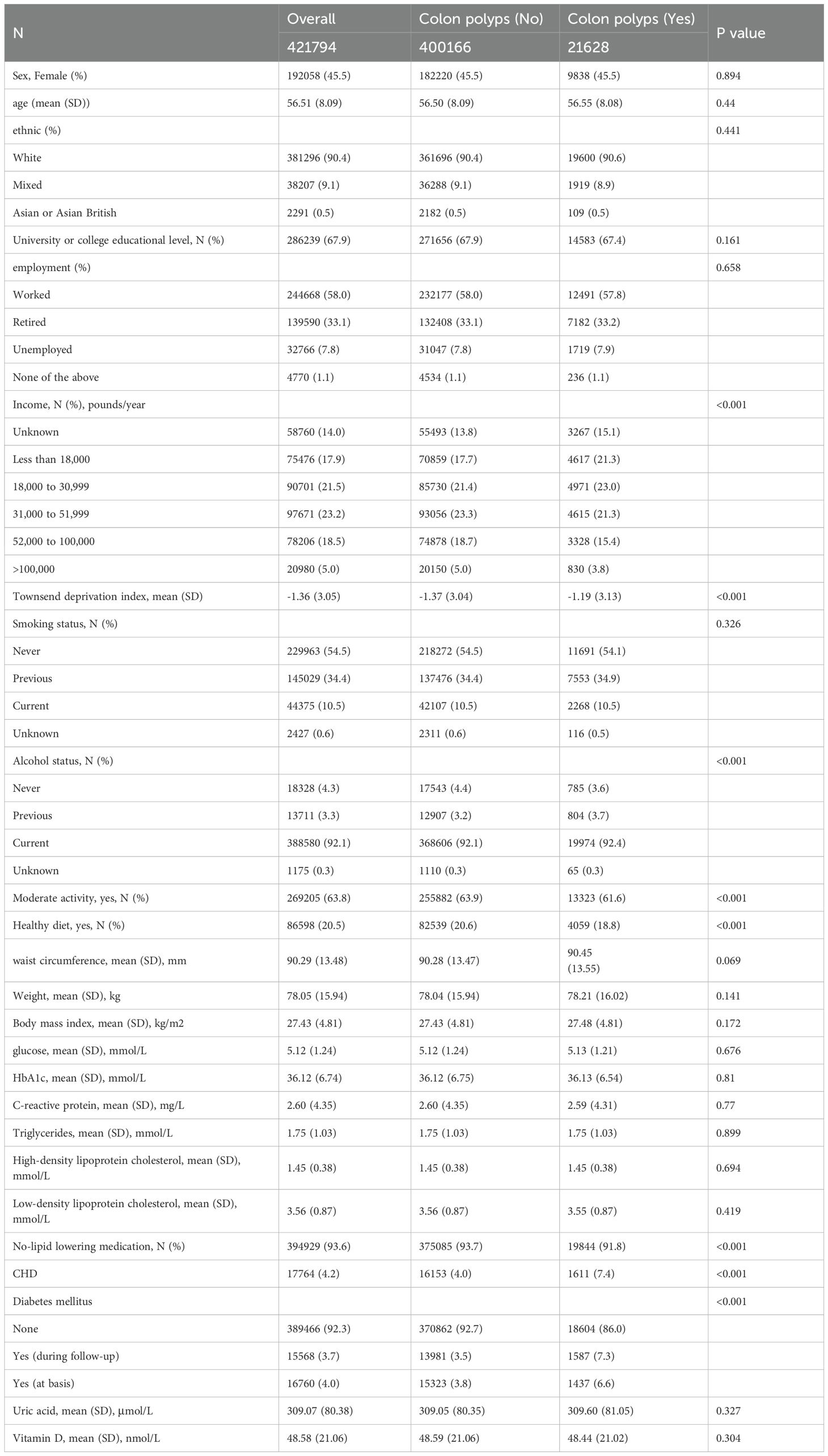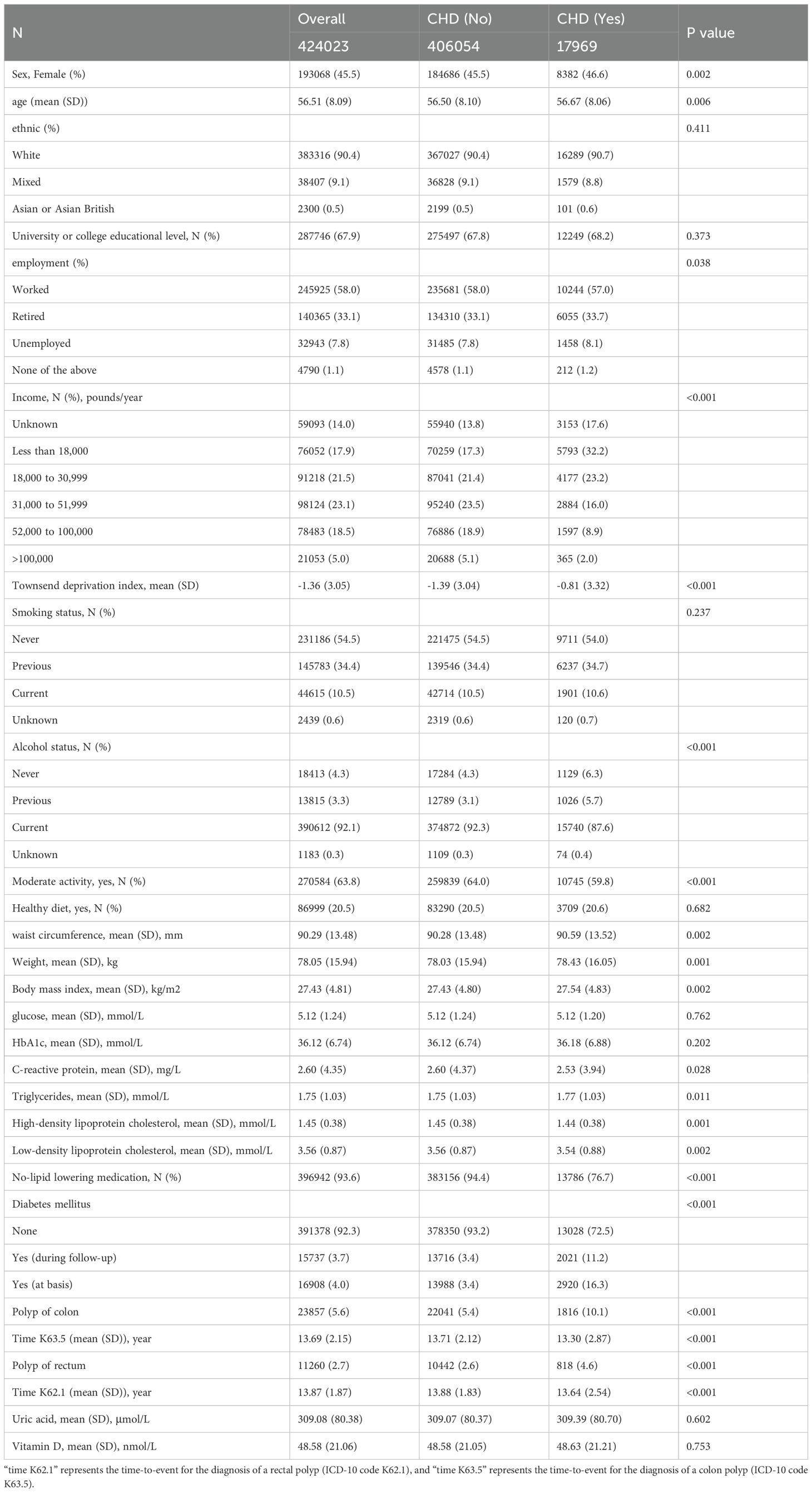 Data were obtained from the UK Biobank, a prospective population-based cohort study that recruited over 500,000 participants aged 40 to 69 years across the United Kingdom between 2006 and 2010 (10). At enrollment, participants provided detailed medical histories, health behavior information, underwent physical assessments, and donated biological samples. The UK Biobank received ethical approval from the relevant research ethics committees and national governance boards, and all participants provided written informed consent. Individuals who withdrew from the study or had deceased were excluded from our analysis. This investigation adhered to the Strengthening the Reporting of Observational Studies in Epidemiology (STROBE) reporting guideline. For the primary analysis, we included 424,023 participants with a history of CHD. In the longitudinal analysis, individuals with existing colon polyps (N = 2,229) or rectal polyps (N = 1,823) at baseline were excluded, resulting in the remaining participants being involved in the time-to-event analysis.