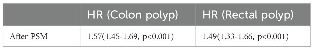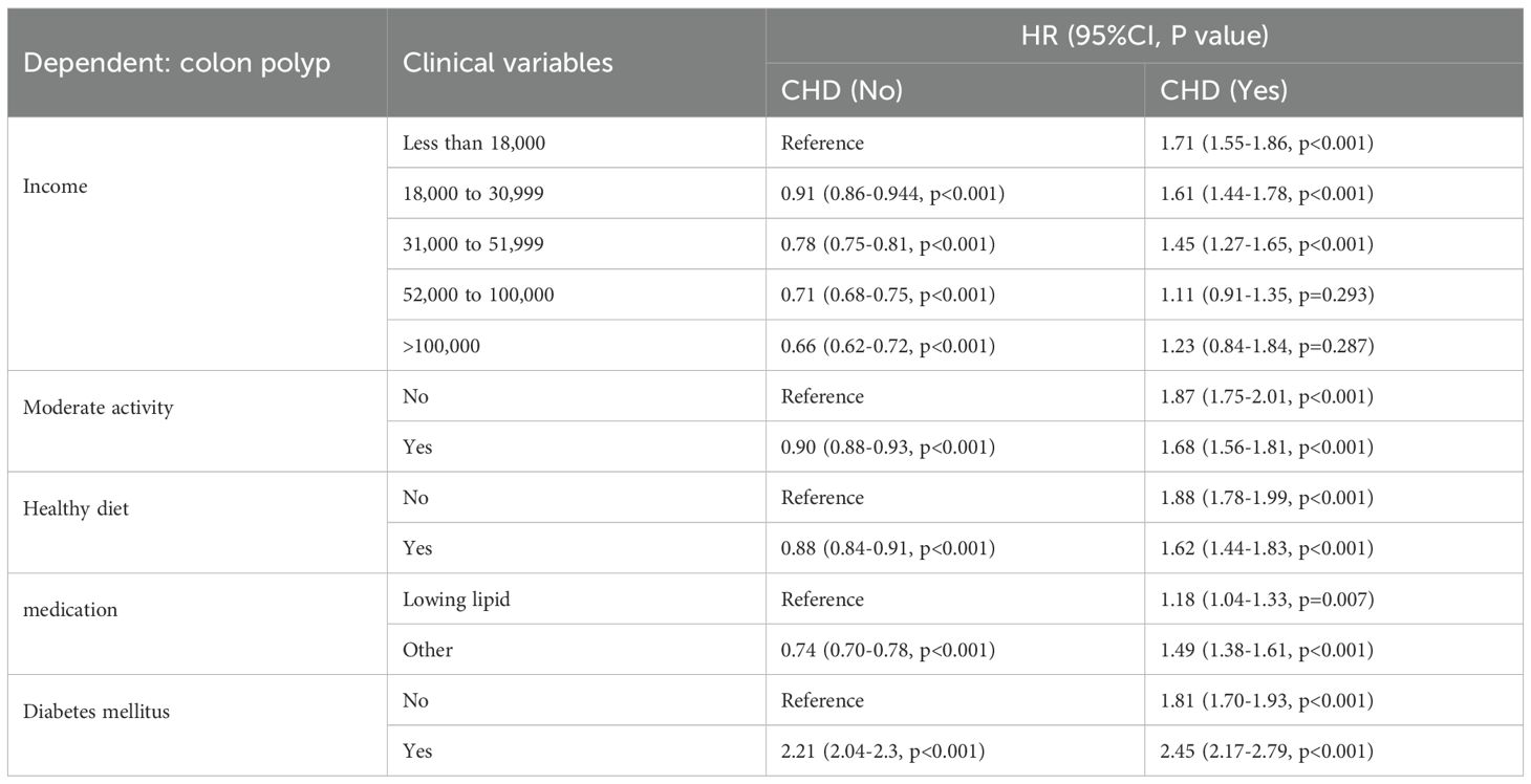 Results: Among the 424,023 individuals with a history of CHD, the prevalence of colon polyps was 5.6%, while that of rectal polyps was 2.7%. In a longitudinal study with over 12 years of follow-up, Cox regression analysis indicated that CHD constitutes an independent risk factor for the occurrence of CRPs, a conclusion that persisted after adjusting for confounding factors via PSM. Additionally, subgroup analysis revealed that, apart from diabetes mellitus (DM), higher income, moderate physical activity, a nutritious diet, and the use of lipid-lowering medications were associated with favorable outcomes for patients with CHD, as evidenced by hazard ratio (HR) values.