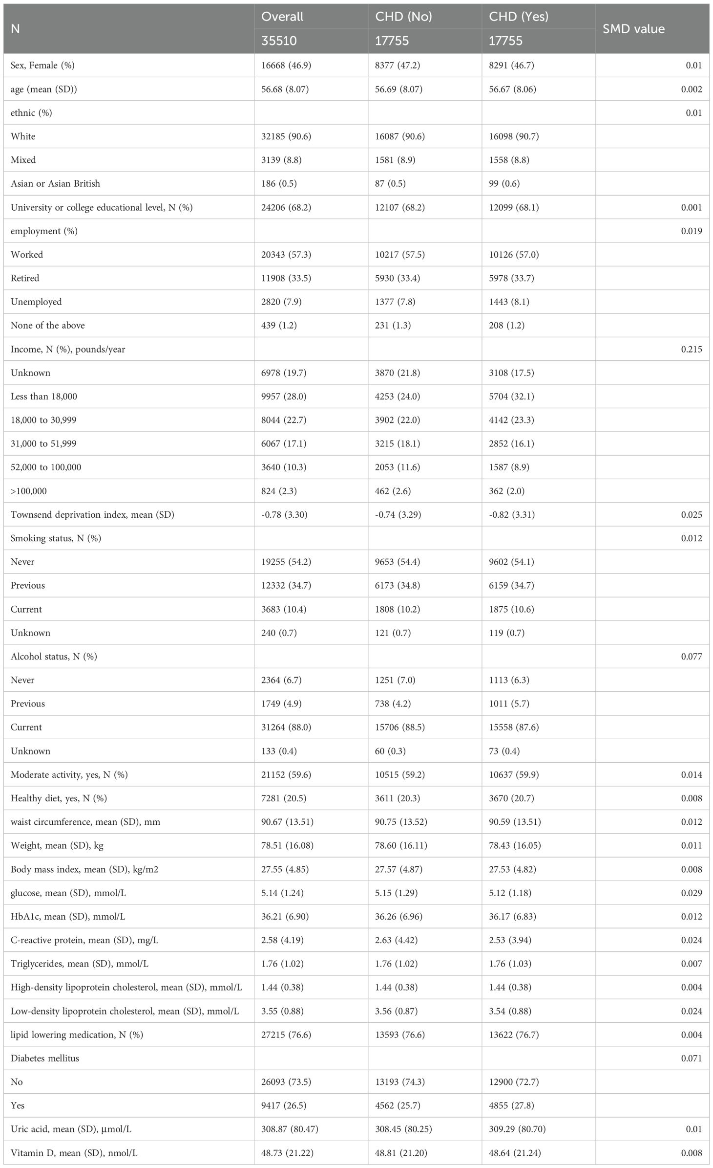 For the statistical analyses, participants were categorized into two groups based on their CHD status. Pearson’s chi-squared test was utilized to examine relationships among categorical variables. To address missing data, which was presumed to occur at random, numerical variable imputation was conducted five times using fully conditional specification and predictive mean matching methods, incorporating all available data as predictors. Initially, a logistic regression model was employed to assess the cross-sectional associations between CHD and C-reactive proteins (CRPs). Subsequently, multivariate logistic regression analyses were performed, with results reported as odds ratios (OR) and 95% confidence intervals (CI). Furthermore, multivariable Cox proportional hazards analyses were executed to evaluate the associations between CHD and CRPs. Statistical significance was determined by a two-tailed P-value of less than 0.05. To address any imbalance in the CHD groups, Propensity Score Matching (PSM) was implemented utilizing the MatchIt package in R software, resulting in harmonized data. The caliper value was established at 0.01, and the balance effect was assessed using the standardized mean difference (SMD), with the objective of achieving an SMD of less than 0.1 for optimal balance (14). The methodological steps were as follows: first, propensity scores for each patient were computed employing a multivariate logistic regression model. Subsequently, patients were matched at a 1:1 ratio between the two groups. Differences across all variables were analyzed and reported based on the SMD values. Finally, correlation analysis was conducted through univariate regression analysis. All statistical analyses were performed using R software (version 4.3.2, StataCorp LLC, College Station, Texas), with results deemed statistically significant when the P-value was below 0.05. A cumulative occurrence curve was utilized to evaluate the incidence of polyps among CHD patients throughout the follow-up period.