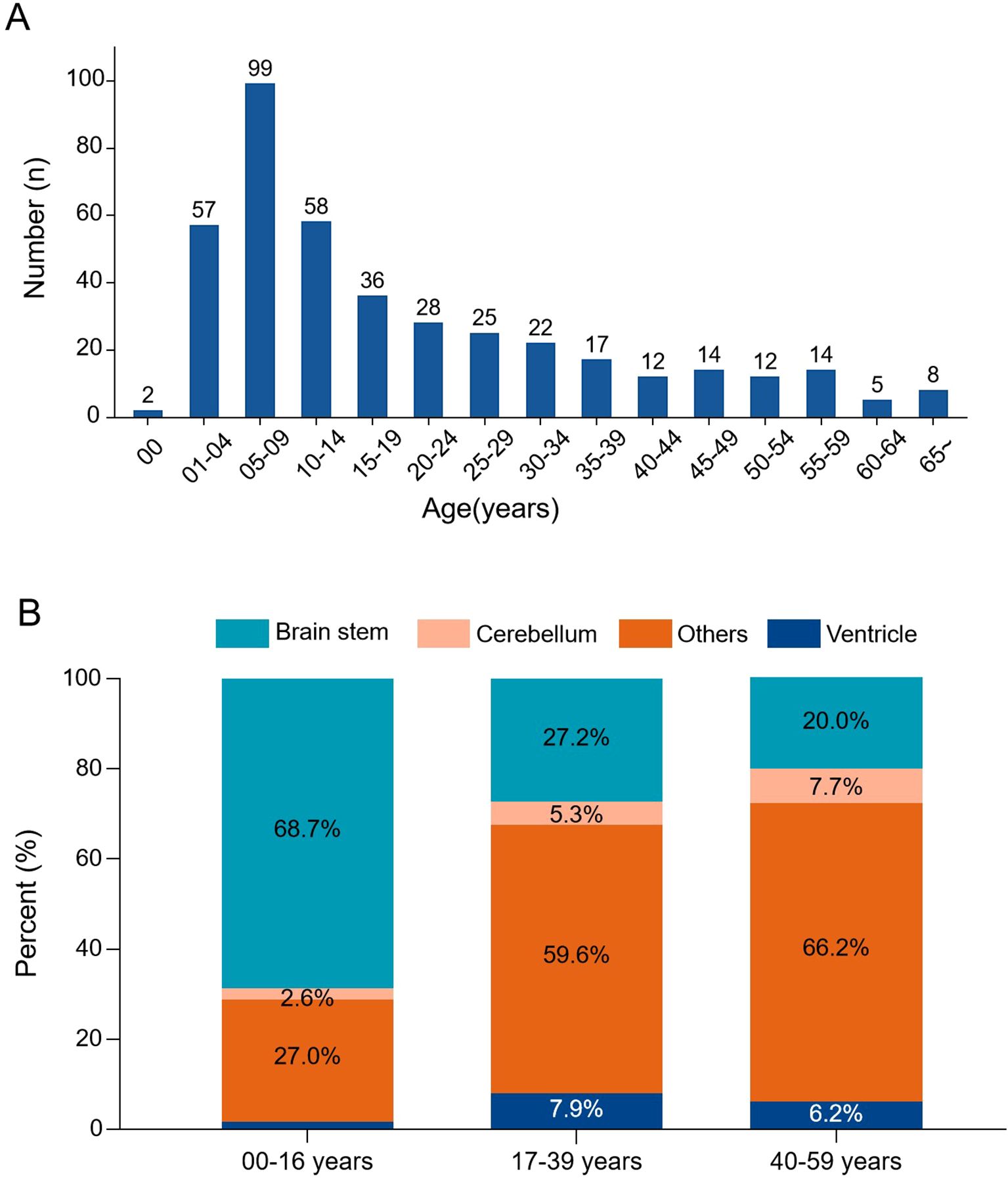 Figure 1. Age distribution and tumor location patterns in DMG. (A) Age-specific incidence histogram showing the number of cases across age groups. (B) Stacked bar chart illustrating tumor location distribution stratified by age groups. Brainstem tumors predominated in pediatric patients, while non-brainstem locations were more frequent in adults.