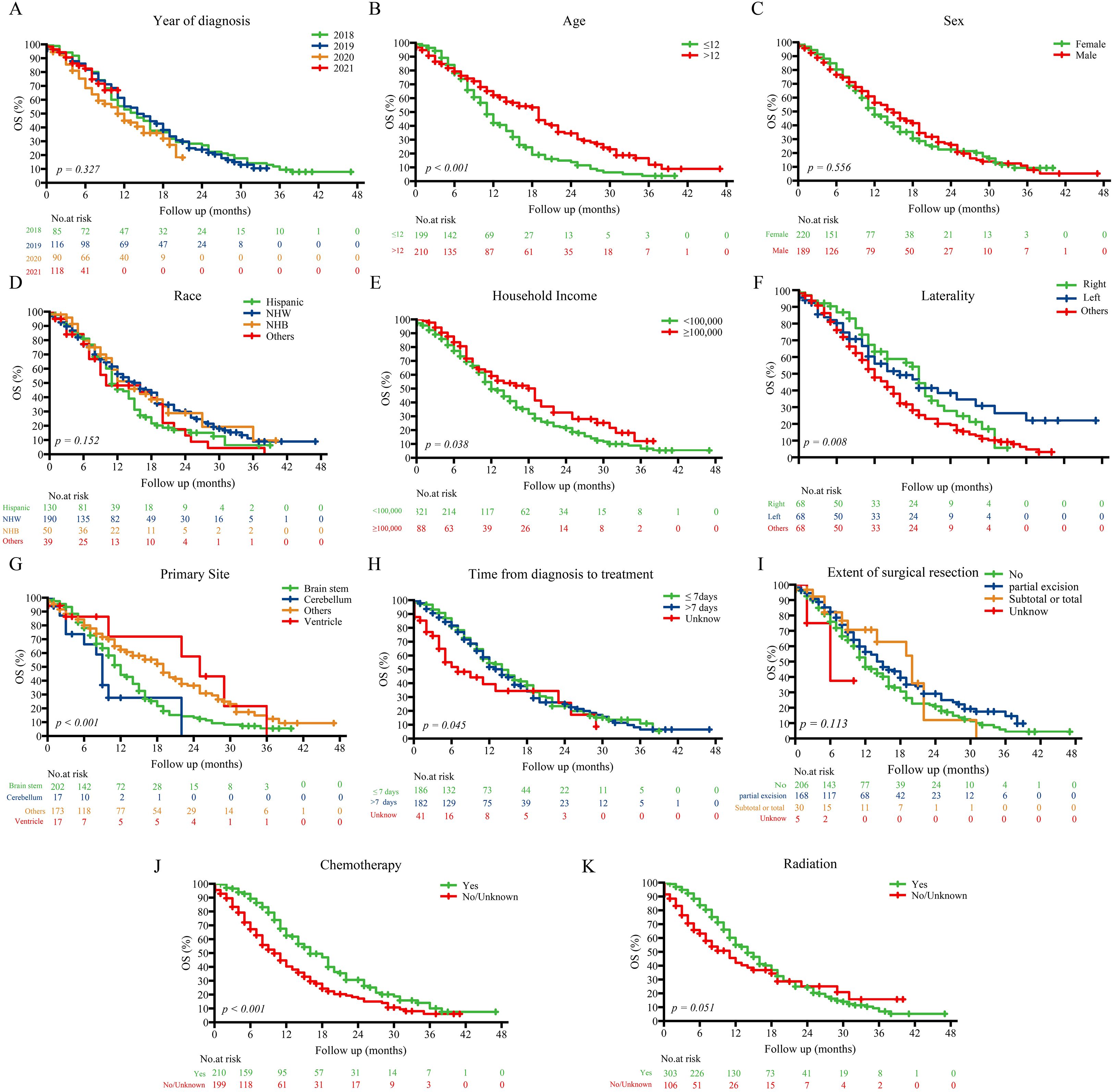 Figure 2. Kaplan–Meier survival curves stratified by prognostic factors in the entire cohort.Kaplan–Meier curves showing overall survival differences across subgroups defined by key prognostic variables: (A) Year of diagnosis; (B) Age; (C) Sex; (D) Race; (E) Household income; (F) Laterality; (G) Primary site; (H) Time from diagnosis to treatment; (I) Extent of surgical resection; (J) Chemotherapy; (K) Radiation. NHW, Non-Hispanic White; NHB, Non-Hispanic Black.