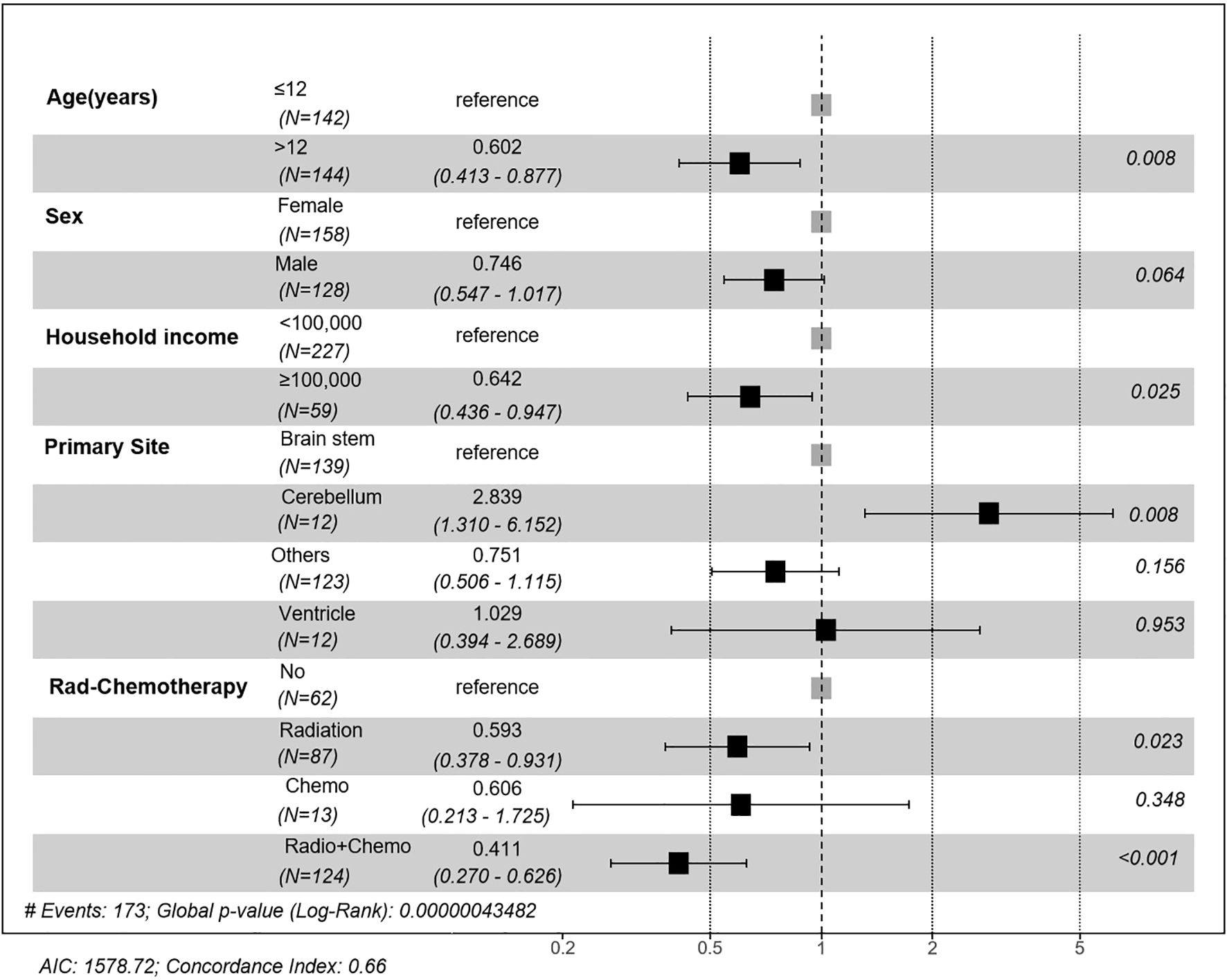 Figure 3. Forest plot of multivariate Cox regression analysis of prognostic factors. Hazard ratios (HR) and 95% confidence intervals (CI) are presented for age, sex, household income, primary site, and treatment modality. Significant prognostic factors included age >12 years, household income ≥$100,000, tumor location, and receiving radiotherapy or combined chemoradiotherapy.