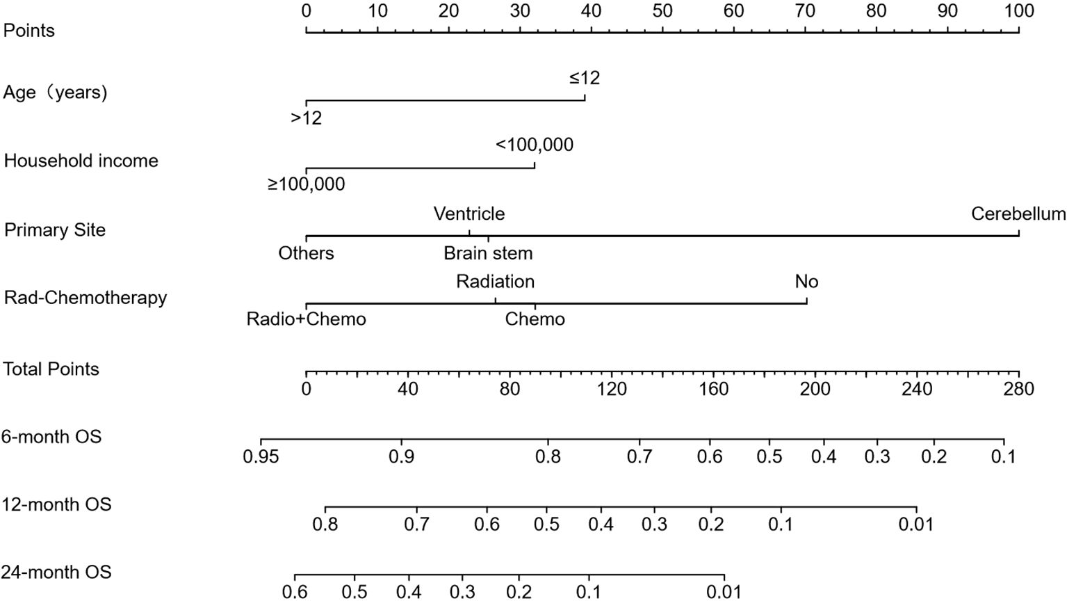 Based on these independent predictors, we developed a nomogram predicting OS at 6, 12, and 24 months (Figure 4). Younger age (≤12 years), lower income, cerebellum location, and lack of treatment (radiotherapy or chemotherapy) corresponded to higher nomogram scores, indicating poorer prognosis.