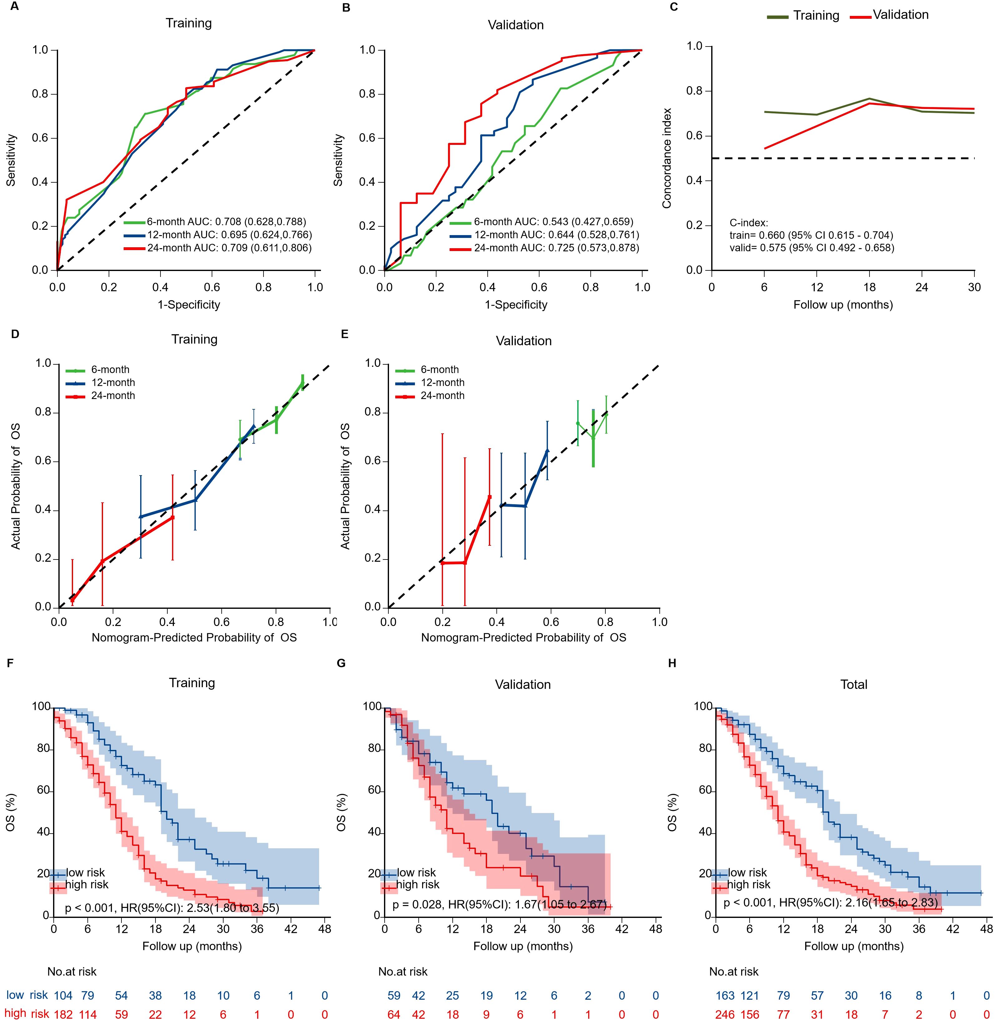Figure 5. Validation of the prognostic nomogram. (A, B) Time-dependent ROC curves evaluating nomogram discrimination in training and validation cohorts. (C) Time-dependent concordance index (C-index) curves for both cohorts. Overall C-index was 0.660 (95% CI: 0.615–0.704) in the training cohort and 0.575 (95% CI: 0.492–0.658) in the validation cohort. (D, E) Calibration curves for 6-, 12-, and 24-month OS showing agreement between predicted and observed survival. (F-H) Kaplan-Meier survival curves stratified by risk groups in training, validation, and overall cohorts. High-risk patients showed significantly worse OS than low-risk patients in all cohorts.