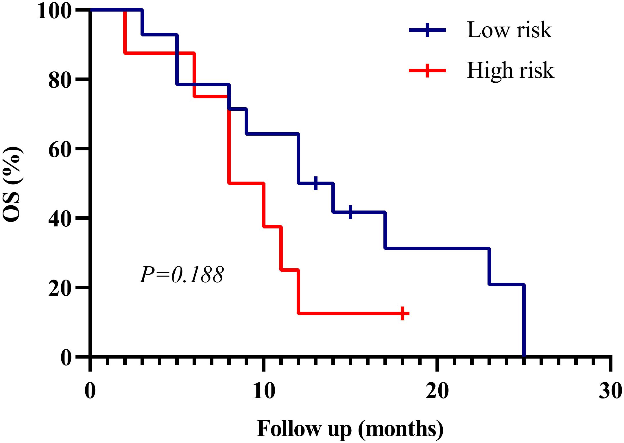 Figure 6. Kaplan–Meier survival curves for external validation cohort (n=22). Patients were stratified into high- and low-risk groups based on the SEER-derived nomogram. Although the difference in overall survival (OS) did not reach statistical significance (p = 0.188), a consistent trend toward better prognosis in the low-risk group was observed, supporting the generalizability of the model.