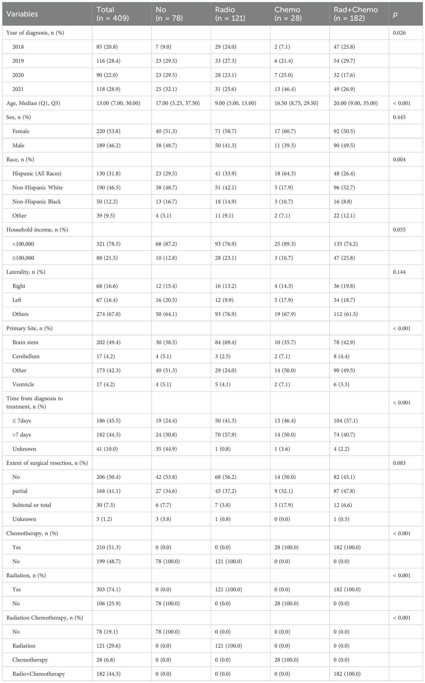 One of the main methodological advances in our study was the introduction of a refined three-tiered classification of therapy (radiation therapy alone, chemotherapy alone, or combined chemoradiotherapy) to overcome the limitations of conventional binary classifications (for example, radiation versus no radiation, chemotherapy versus no chemotherapy).Our analysis showed that chemotherapy alone did not provide a survival benefit, while the combination treatment significantly improved the outcome — thus correcting the misleading conclusion that only chemotherapy in the binary analysis improved the prognosis. This difference can be explained by the fact that the brain stem and thalamic areas are particularly intact (BBB), which limits the penetration of chemotherapy agents like temozolomide (TMZ), and eventually reduces the effectiveness of monotherapy (27–29). In addition, the methylation of the MGMT promoter is typically absent in DMG, resulting in a poor efficacy of TMZ (27, 30). On the contrary, it has been found that radiation therapy can temporarily destroy the blood-brain barrier, which may increase the delivery efficiency and therapeutic efficacy of chemotherapy drugs at the tumor site (31). Although SEER lacks molecular data, these interpretations are supported by biological plausibility and prior literature. These findings highlight the need for individualized treatment regimens based on tumor location and biological characteristics, ideally guided by future molecular-integrated datasets.