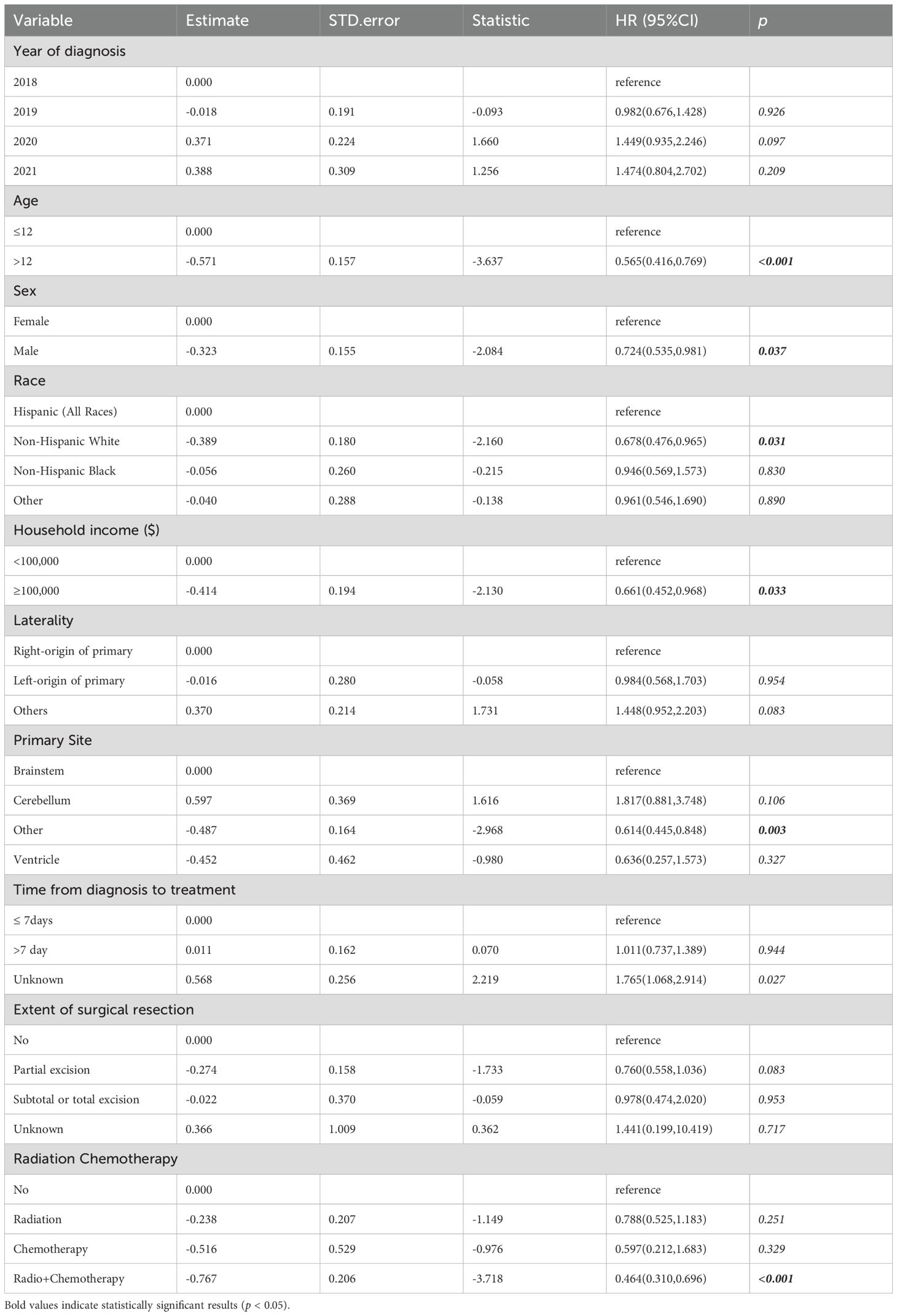 Univariate Cox regression analysis (Table 2) showed protection factors, including age >12 years (HR = 0.565, 95%CI 0.416-0.769; p<0.001), male sex (HR = 0.724, 95%CI 0.535-0.981; p=0.037), non-Hispanic White ethnicity (HR = 0.678, 95%CI 0.476-0.965; p=0.031), and higher income (≥$100,000; HR = 0.661, 95%CI 0.452-0.968; p=0.033). Conversely, the lack of chemotherapy (HR = 1.814, 95%CI 1.338-2.458; p<0.001) or radiotherapy therapy (HR = 1.608, 95%CI 1.129-2.289; p=0.008) independently predicted poorer results.