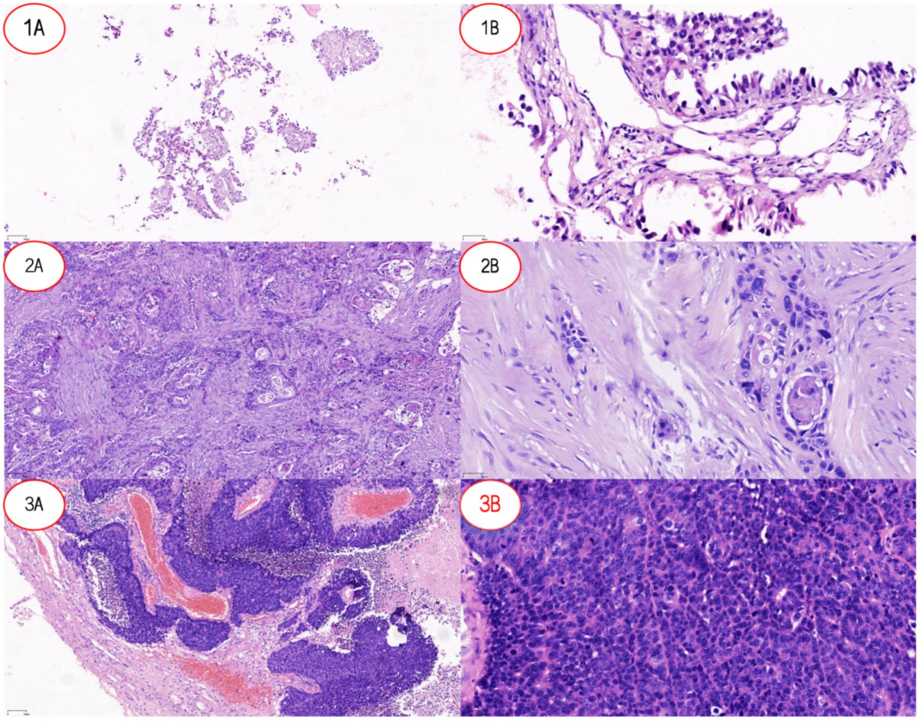Figure 1. Pathological features of lung cancer and lung cancer brain metastases. (1A) Low-power view (×10) of LUAD-BM showing tumor tissue arranged in an acinar pattern with loose distribution. (1B) High-power view (×20) of LUAD-BM demonstrating columnar tumor cells forming glandular structures, consistent with adenocarcinoma differentiation. (2A) Low-power view (×10) of LUSC revealing nested tumor growth with well-defined stromal boundaries. (2B) High-power view (×20) of LUSC highlighting polygonal tumor cells with focal keratinization, characteristic of squamous cell carcinoma morphology. (3A) Low-power view (×10) of SCLC-BM displaying densely infiltrating tumor cells with stromal hemorrhage. (3B) High-power view (×20) of SCLC-BM showing small tumor cells with hyperchromatic nuclei (high nuclear-to-cytoplasmic ratio) diffusely distributed, typical of small cell carcinoma. Abbreviations: LUAD-BM, lung adenocarcinoma brain metastasis; LUSC, lung squamous cell carcinoma; SCLC-BM, small cell lung cancer brain metastasis.