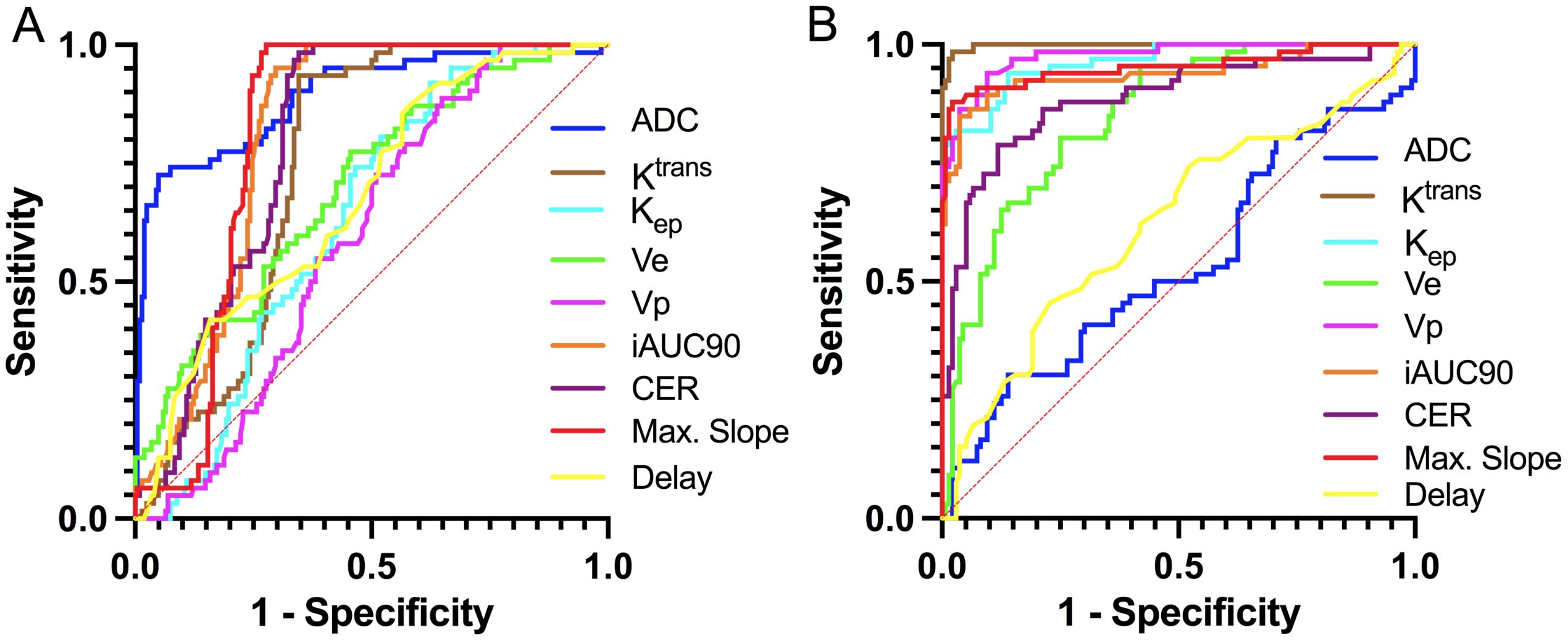 Figure 2. ROC curves for discriminating histopathological subtypes of LCBM based on DCE-MRI and DWI parameters. (A) SCLC vs. NSCLC; (B) CLC-BM vs. NSCLC-BM.