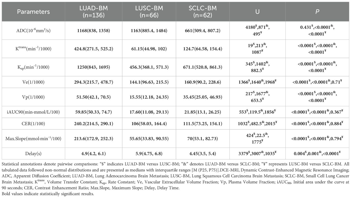 Methods: A prospective cohort of 114 LCBM patients (63 lung adenocarcinoma [LUAD]-BM, 28 lung squamous cell carcinoma [LUSC]-BM, 23 small cell lung cancer [SCLC]-BM) underwent DCE-MRI and DWI on a 3.0T MRI scanner. Parameters including volume transfer constant (Ktrans), rate constant (Kep), extravascular extracellular volume (Ve), and plasma volume fraction (Vp) were derived using the Extended Tofts model. Group differences were analyzed via Mann-Whitney U test, diagnostic efficacy via ROC curves, and parameter interactions via multivariate logistic and linear regression.