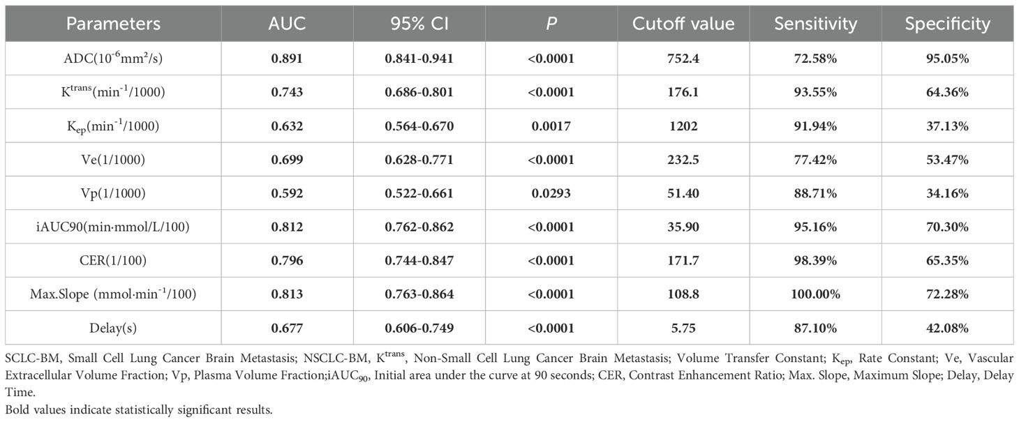 In differentiating SCLC-BM from NSCLC-BM, the ADC value demonstrated the highest efficacy (AUC = 0.891, p<0.0001). Using a cutoff value of 752.4 × 10-6 mm²/s, the sensitivity was 72.58% and specificity was 95.05%. A low ADC value (≤752.4 × 10-6 mm²/s) strongly indicated SCLC-BM. Among DCE-MRI parameters, Max. Slope exhibited good diagnostic capability (AUC = 0.813, p<0.0001), with 100% sensitivity and 72.28% specificity at a cutoff of 108.8 mmol·min-¹/100. iAUC90 also showed high diagnostic performance (AUC = 0.812), with 95.16% sensitivity and 70.30% specificity at a cutoff of 35.90 min·mmol/L/100. Both parameters achieved high sensitivity and specificity. CER and Ktrans showed moderate diagnostic efficacy (AUC = 0.796 and 0.743, respectively). For CER, a cutoff of 171.7/100 yielded 98.39% sensitivity and 65.35% specificity. For Ktrans, a cutoff of 176.1 min-¹/1000 resulted in 93.55% sensitivity and 64.36% specificity. Ve and Kep demonstrated limited diagnostic utility (AUC = 0.699 and 0.632, respectively), with Kep showing high sensitivity (91.94%) but low specificity (37.13%).