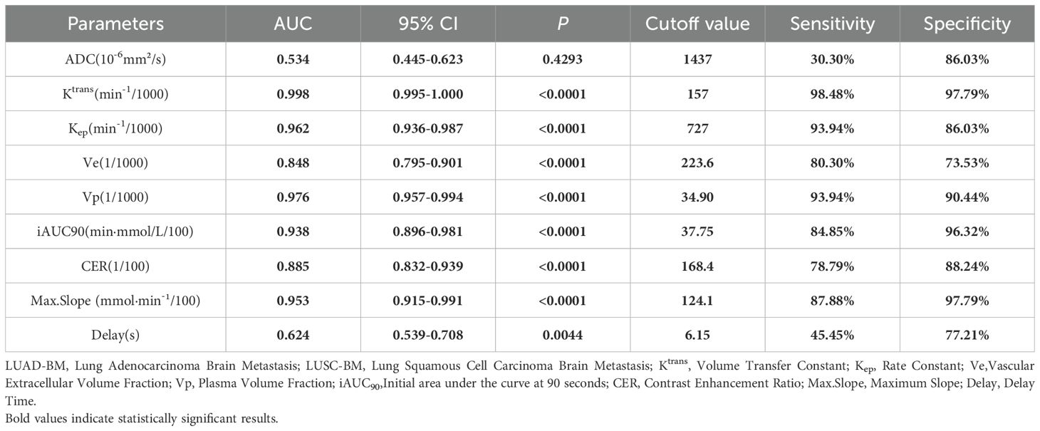 In differentiating LUAD-BM from LUSC-BM, DCE-MRI parameters exhibited superior reliability. The Ktrans parameter achieved near-perfect diagnostic performance (AUC = 0.998, p<0.0001), with 98.48% sensitivity and 97.79% specificity at a cutoff of 157 min-¹/1000, establishing it as the core diagnostic indicator. Vp and Max. Slope also demonstrated excellent efficacy (AUC = 0.976 and 0.953, respectively). For Vp, a cutoff of 34.90/1000 resulted in 93.94% sensitivity and 90.44% specificity. For Max. Slope, a cutoff of 124.1 mmol·min-¹/100 yielded 87.88% sensitivity and 97.79% specificity. Kep and iAUC90 also performed notably well (AUC = 0.962 and 0.938, respectively). At cutoffs of 727 min-¹/1000 and 37.75 min·mmol/L/100, they achieved sensitivities of 93.94% and 84.85%, and specificities of 86.03% and 96.32%. Ve and CER parameters showed moderate efficacy (AUC = 0.848 and 0.885, respectively), with sensitivities of 80.30% and 78.79% and specificities of 73.53% and 88.24% at cutoffs of 223.6/1000 and 168.4/100. In contrast, the ADC value (AUC = 0.534, p=0.4293) lacked statistical significance and was ineffective for differentiating LUAD-BM from LUSC-BM.