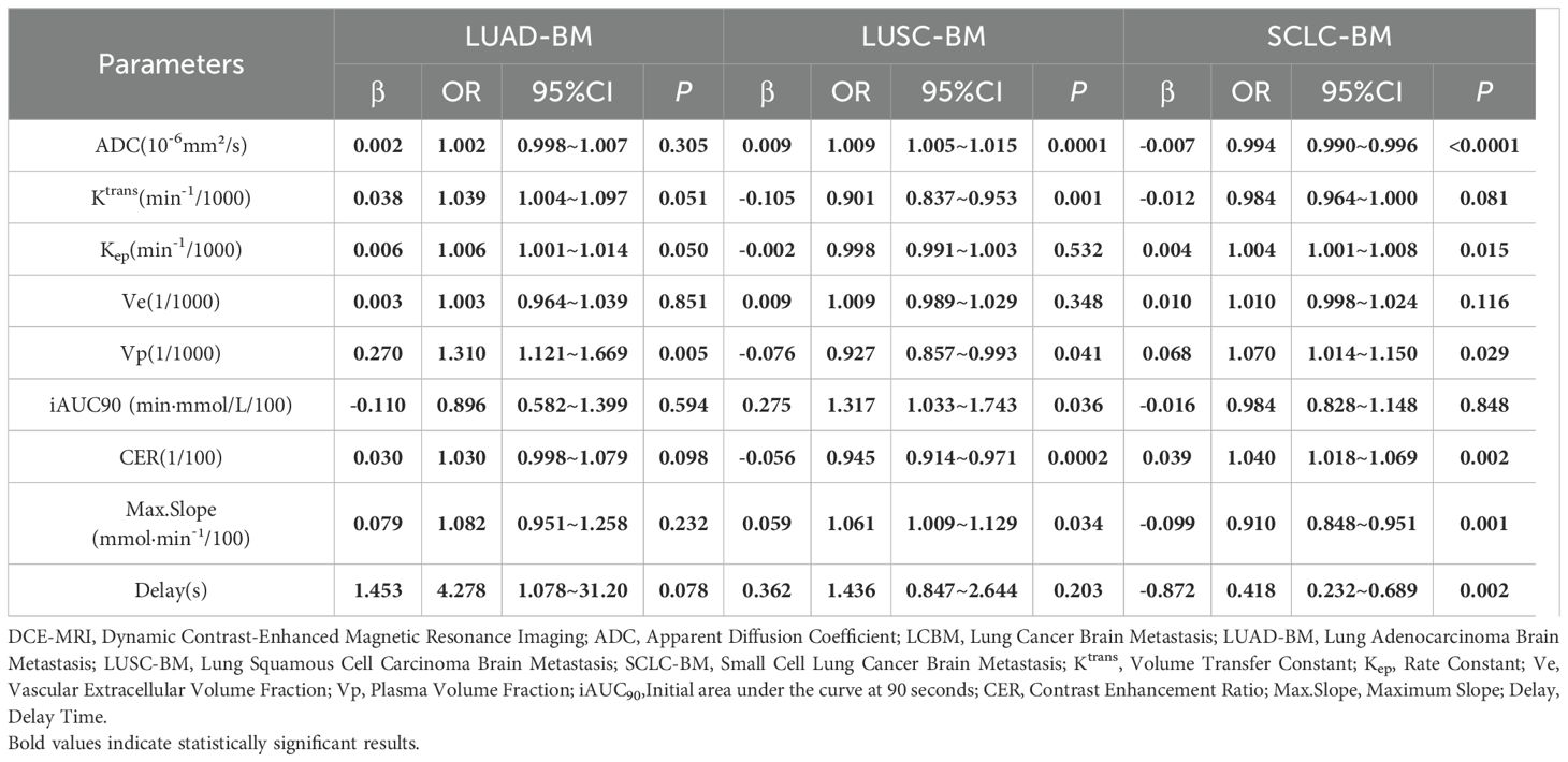 Quantifying the contributions of ADC values and DCE-MRI parameters to different histopathological LCBM subtypes using logistic regression
