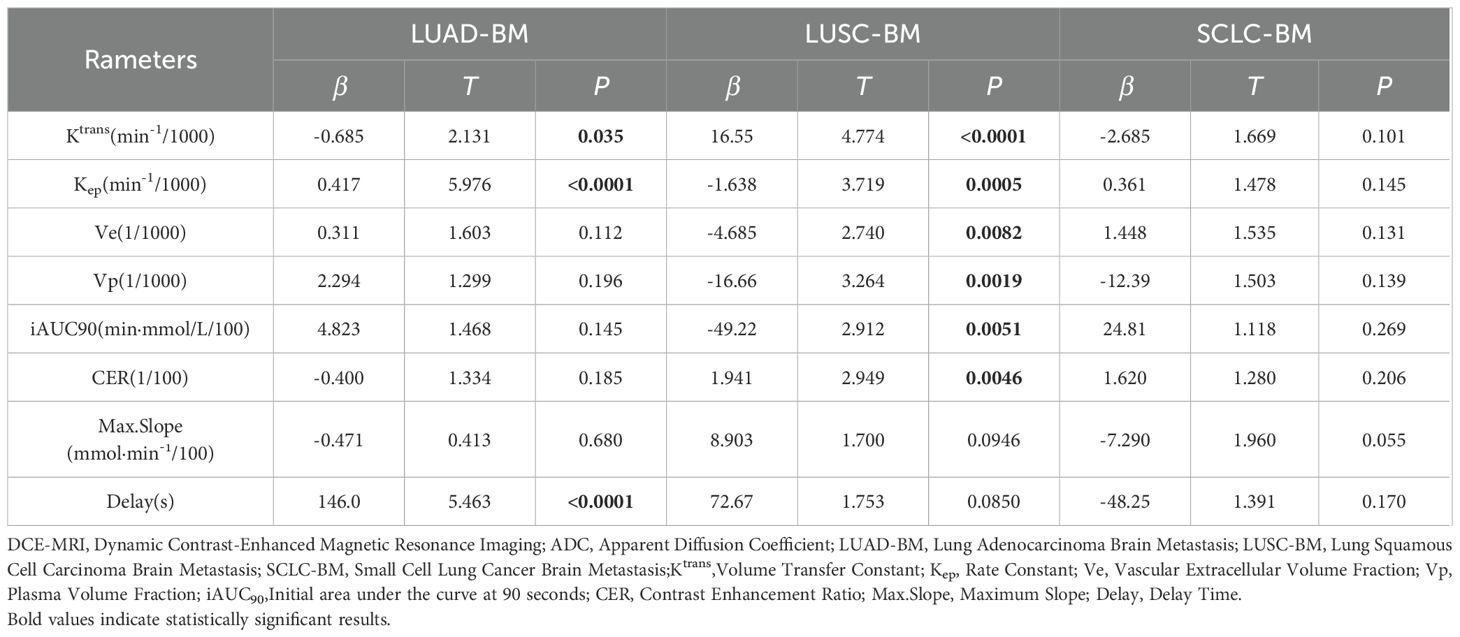 Multivariate linear regression analysis revealed distinct pathological subtype-specific influences of DCE-MRI parameters on ADC values in LCBM. as detailed in Table 5.