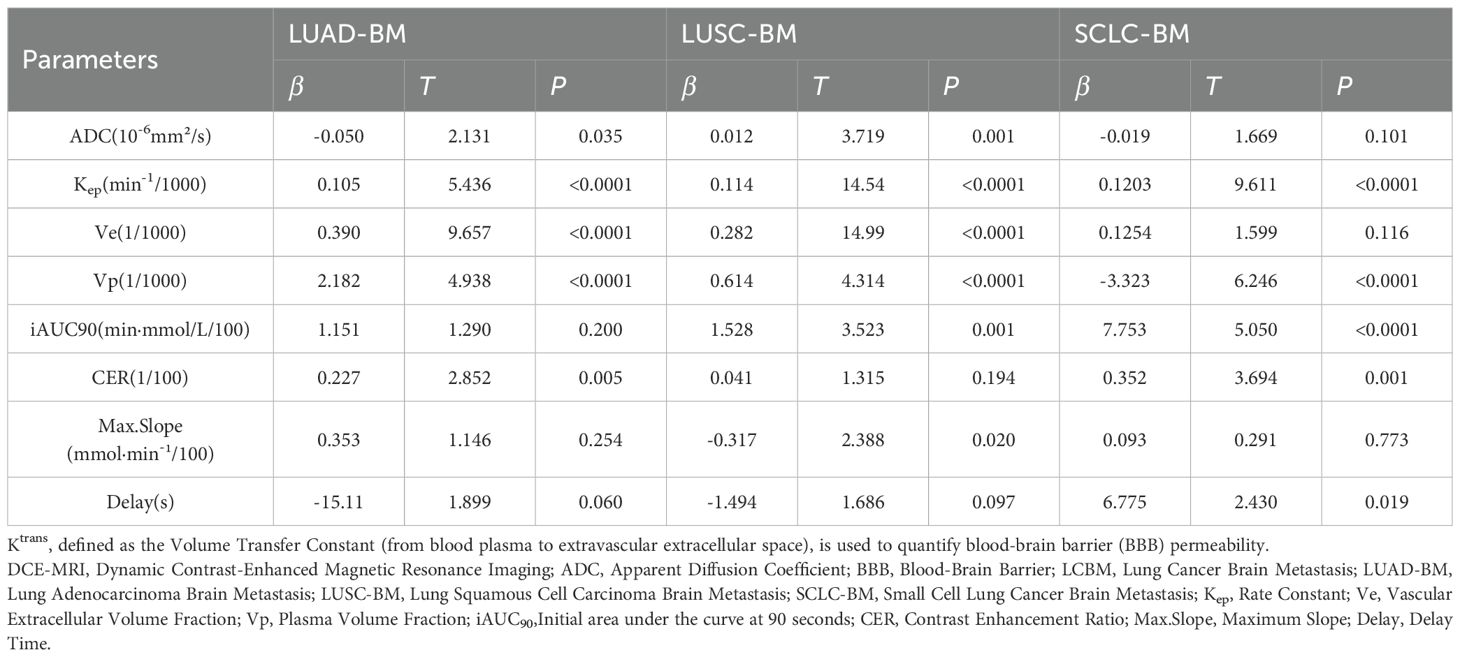 In SCLC-BM, Ktrans was prominently enhanced by Kep (β=0.1203,p<0.0001) and iAUC90 (β=7.753,p<0.0001), with CER further elevating permeability (β=0.352,p=0.001). Notably, Vp reduction (β=−3.323,p<0.0001) and prolonged Delay (β=6.775,p=0.019) revealed unique regulatory mechanisms. ADC (β=−0.019,p=0.101), Ve(β=0.1254,p=0.116), and Max.Slope (β=0.093,p=0.773) showed no significant effects. Collectively, BBB permeability regulation exhibited pathology-dependent patterns: LUAD-BM was dominated by microvascular function (Vp) and extracellular space (Ve); LUSC-BM relied on vascular transport kinetics (Kep) and enhancement kinetics (iAUC90); SCLC-BM demonstrated antagonistic effects between abnormal contrast agent kinetics (Kep/iAUC90) and microvascular density (Vp).