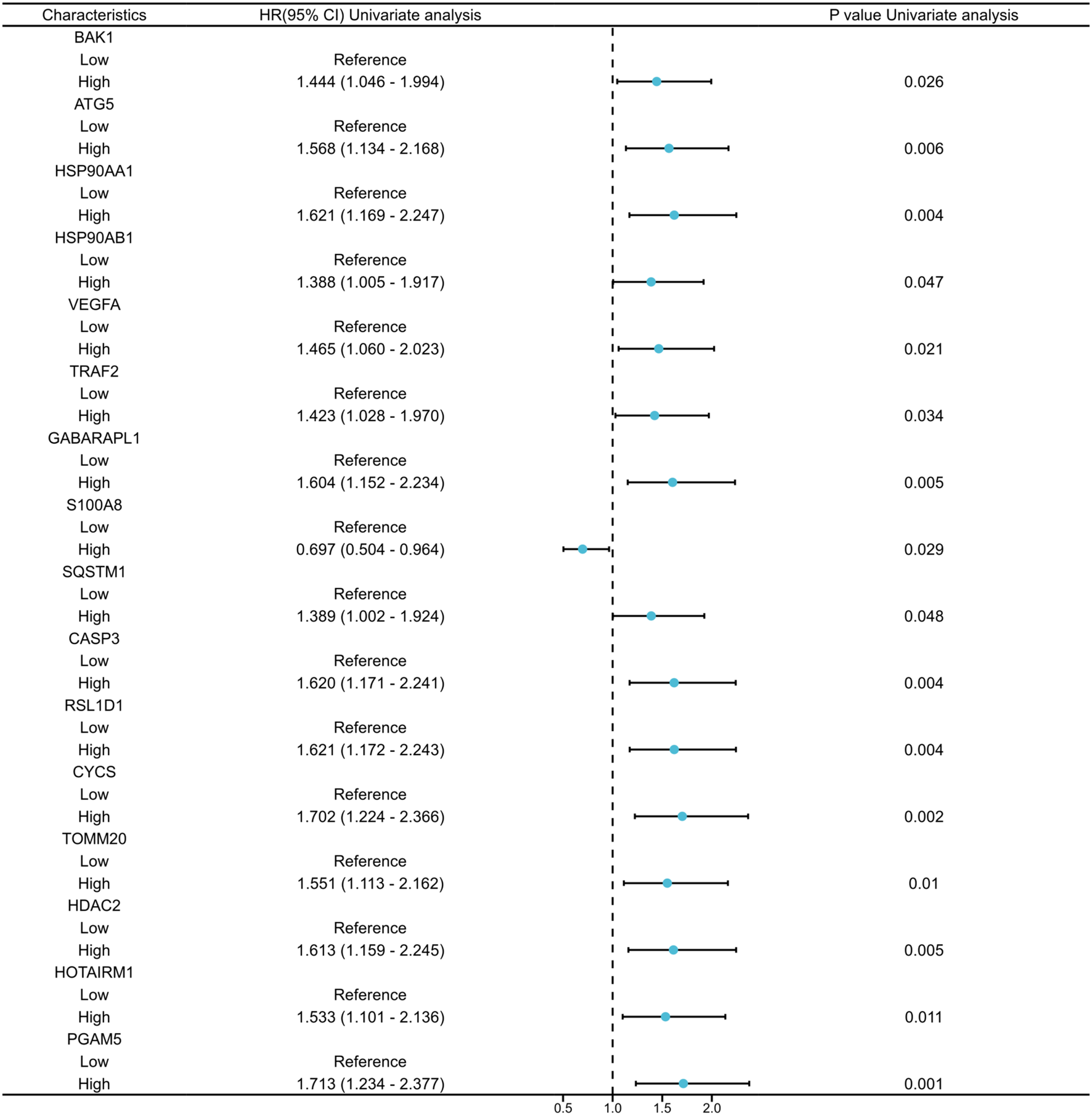 Univariate Cox regression analysis of the 16 co-expressed genes.