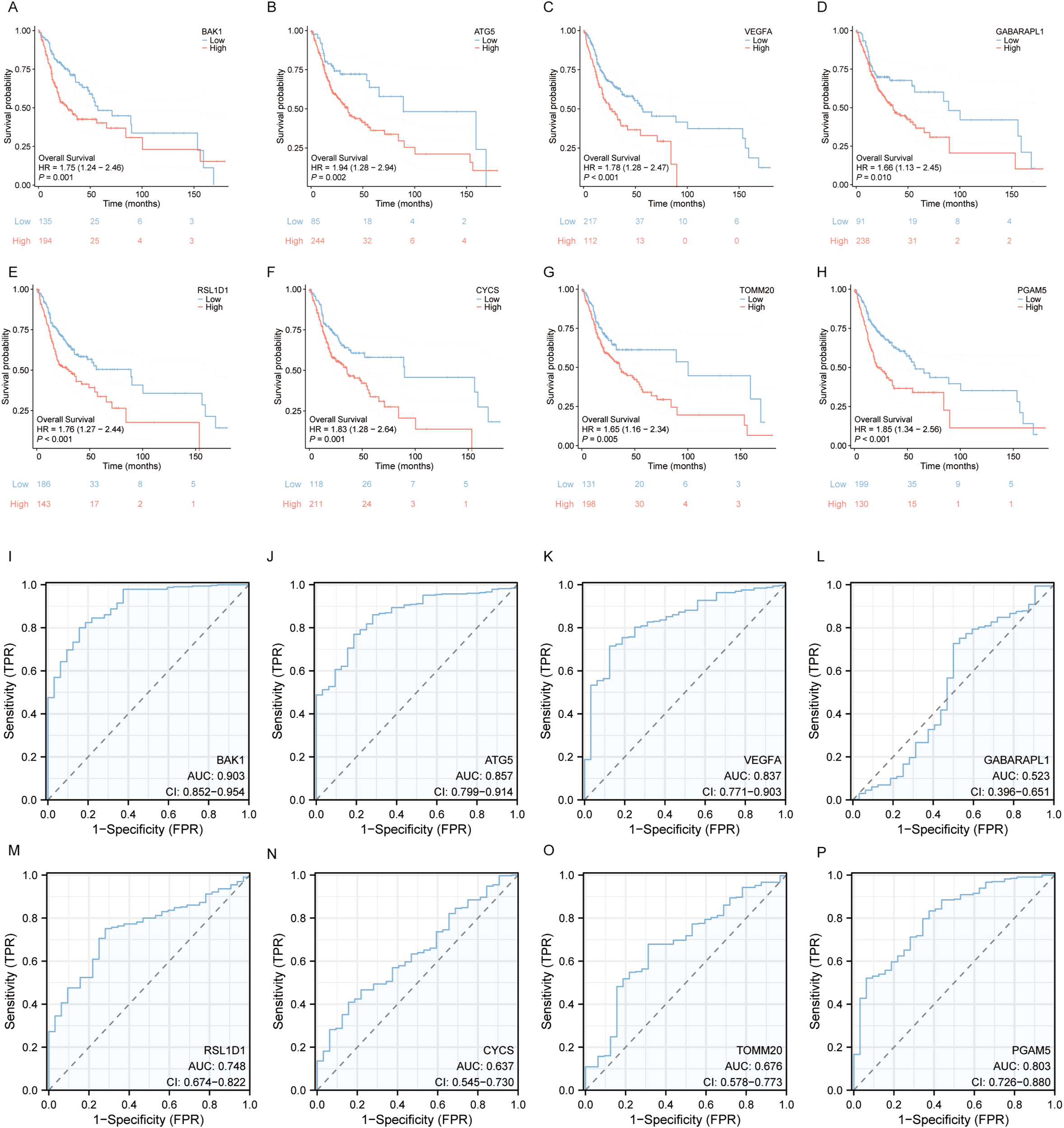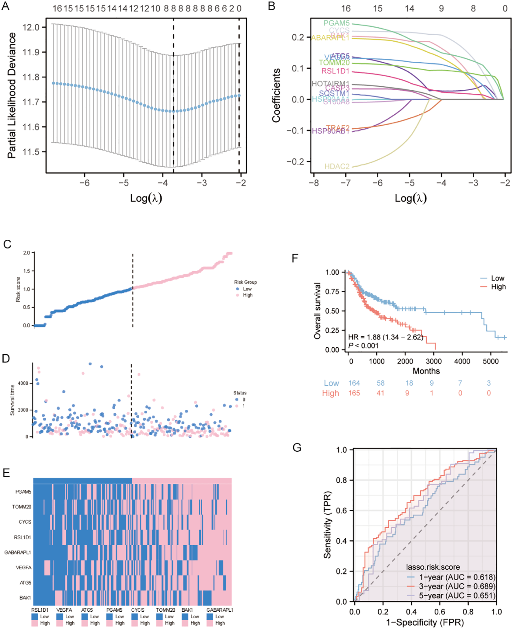 The 16 autophagy and pyroptosis related genes identified were subjected to LASSO regression model to optimize model parsimony and mitigate collinearity and overfitting (Figure 3A). Methodologically, we implemented 10-fold cross-validation and selected λmin as the optimal regularization threshold. This analysis resulted in a final prognostic model containing 8 genes: BAK1, ATG5, VEGFA, GABARAPL1, RSL1D1, CYCS, TOMM20, and PGAM5 (Figure 3B).