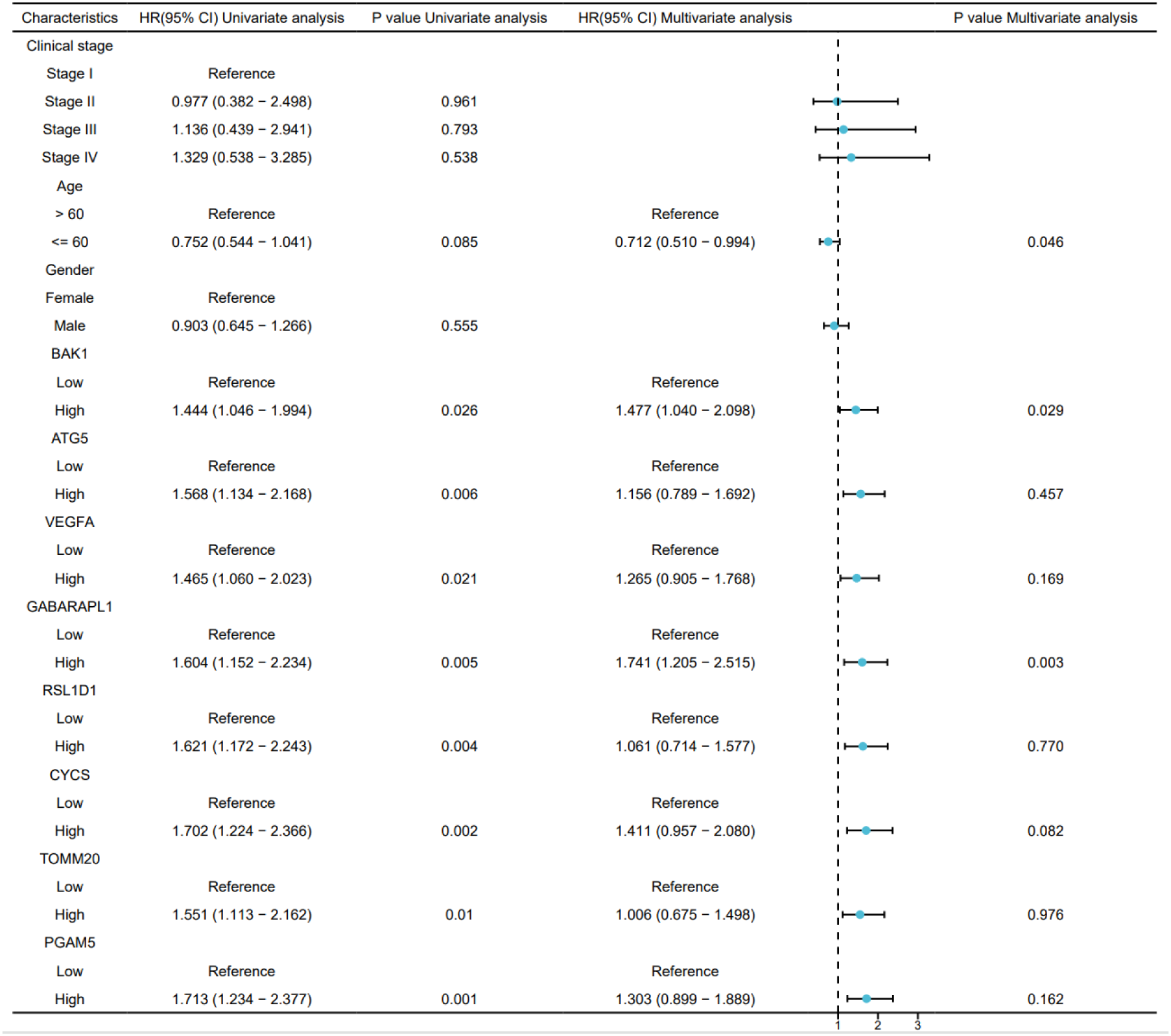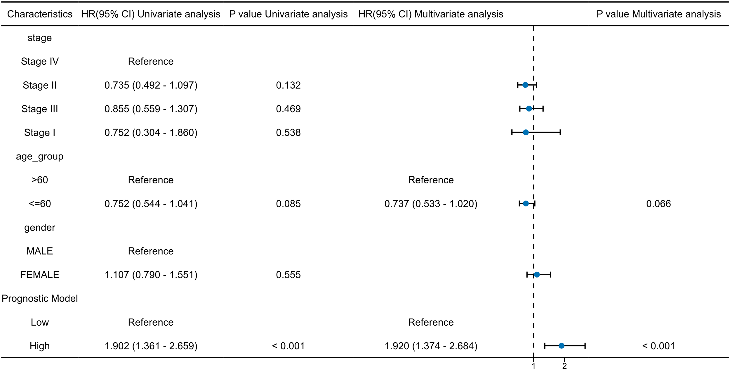 To reduce model complexity and improve interpretability, we calculated a combined risk score for each patient by applying a weighted linear combination of the expression levels of the eight prognostic genes, with weights derived from the LASSO-Cox regression coefficients. This risk score was then evaluated for its prognostic independence using univariate and multivariate Cox proportional hazards regression analyses. Clinical covariates including clinical tumor stage, age and gender were included in the multivariate model to control for potential confounding.