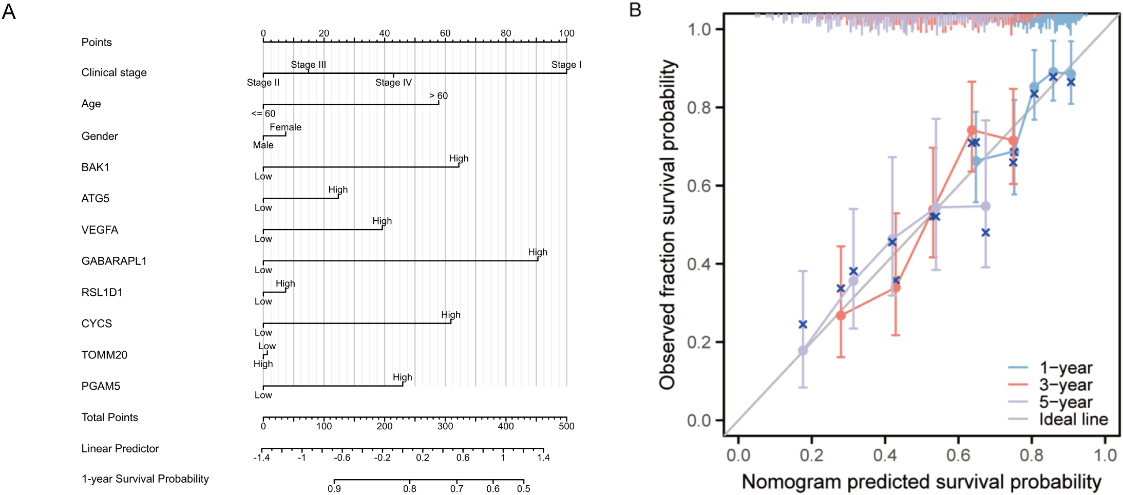 (A) Prognostic nomogram integrating key clinical characteristics and prognostic model genes. (B) Calibration curve assessing the nomogram’s accuracy in predicting survival probabilities at 1, 3, and 5 years.