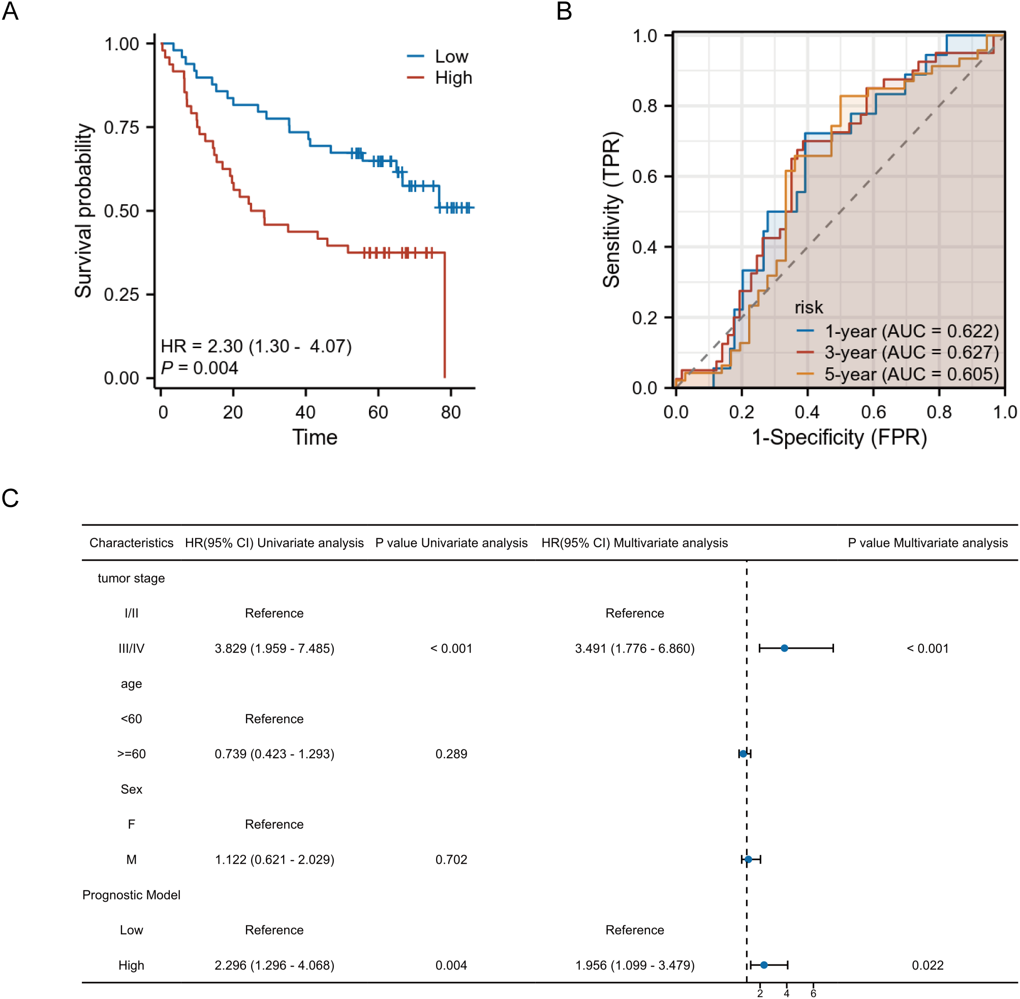 Kaplan-Meier survival analysis revealed a statistically significant difference in overall survival between the high-risk and low-risk groups, as stratified by the model. Patients in the high-risk group exhibited a markedly poorer prognosis compared to those in the low-risk group, with a hazard ratio (HR) of 2.30, supporting the model’s ability to effectively discriminate patient outcomes. (Figure 8A) Time-dependent ROC curve analysis further demonstrated the prognostic performance of the model across different time points. The area under the ROC curve (AUC) was 0.622 for 1-year survival, 0.627 for 3-year survival, and 0.605 for 5-year survival, indicating a consistent predictive capacity of the model over time. (Figure 8B) In the univariate and multivariate Cox regression analyses, the combined risk score derived from the prognostic model remained an independent predictor of survival after adjusting for other clinical parameters. Specifically, in multivariate analysis, high-risk patients had a significantly increased hazard of death, independent of tumor stage, age, and sex. Tumor stage also emerged as an independent prognostic factor, with advanced stages (III/IV) associated with significantly worse outcomes (Figure 8C).