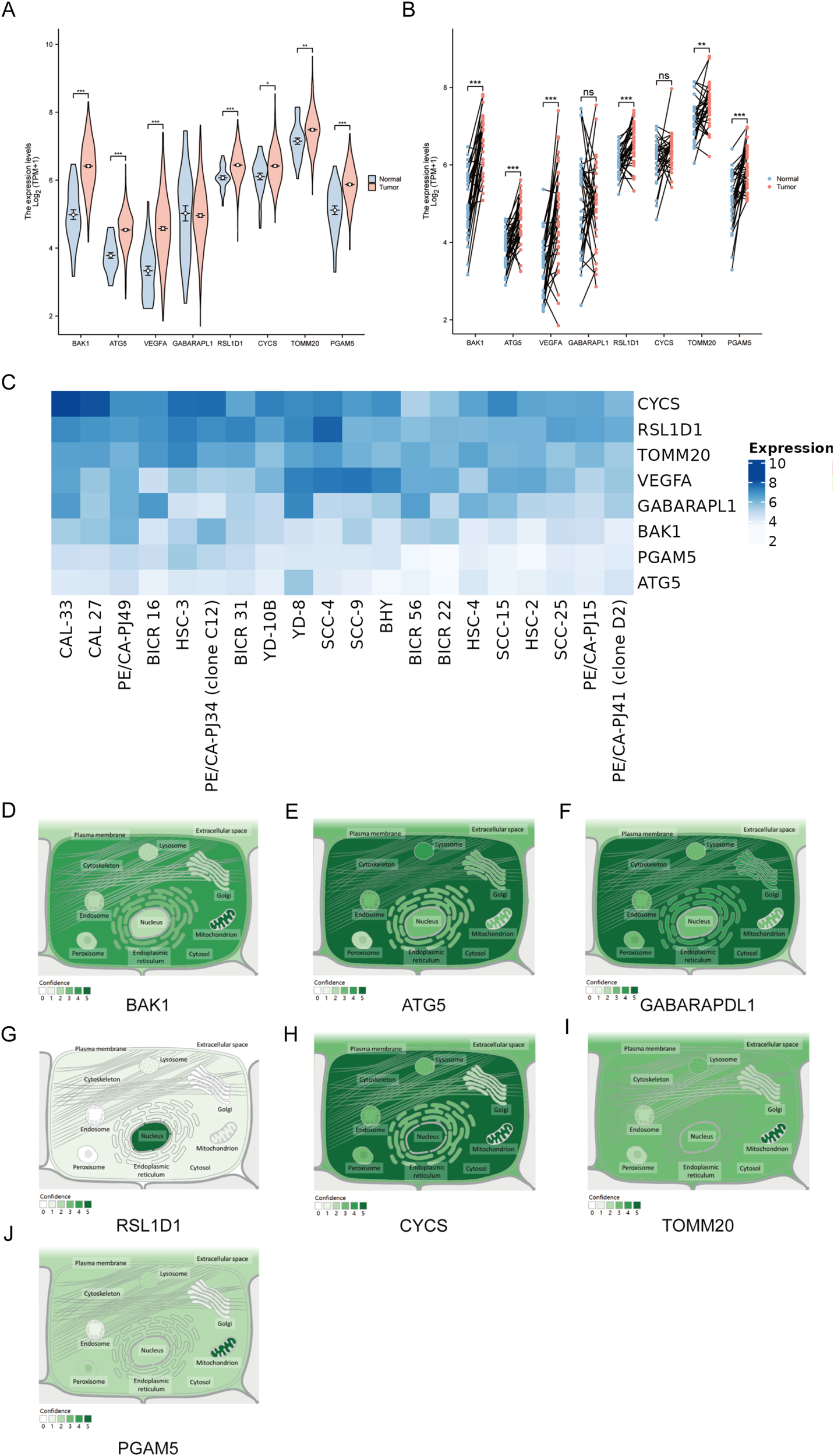 Compared to normal samples, the expression of all genes, except for GABARAPL1, was significantly higher in OSCC tumor tissues. Specifically, 7 genes (BAK1, ATG5, VEGFA, RSL1D1, CYCS, TOMM20, and PGAM5) exhibited elevated expression levels in OSCC tumors. Paired sample plots further revealed that GABARAPL1 and CYCS expression levels did not differ significantly among tumor, adjacent and normal tissues. In contrast, the remaining six genes (BAK1, ATG5, VEGFA, RSL1D1, TOMM20, PGAM5) displayed markedly elevated expression in OSCC tumors compared to paired adjacent or normal tissues (Figures 9A, B). Next, the heatmap more intuitively demonstrates universal upregulation of the eight genes across 20 OSCC cell lines (Figure 9C). The intracellular environment can be further partitioned into distinct organelles or regions, termed subcellular compartments. Mature proteins require specific subcellular organelles to exert stable biological functions, while subcellular structures provide relatively independent microenvironments for their functional execution. Subcellular localization aims to determine the precise intracellular location of target genes (e.g., nucleus, cytoplasm, endoplasmic reticulum, or plasma membrane), thereby elucidating their functional mechanisms. GeneCards provides comprehensive subcellular localization data; however, VEGFA localization information was unavailable in this study. Notably, except for RSL1D1, which was primarily localized to the nucleus, the remaining seven genes (BAK1, ATG5, VEGFA, CYCS, TOMM20, PGAM5, and GABARAPL1) were predominantly distributed in extranuclear cytoplasmic regions or concentrated within specific organelles. Notably, BAK1 is predominantly found in the mitochondria and cytoplasm, while ATG5 accumulates more in the cytoplasm, cytoskeleton, and lysosomal regions. GABARAPL1 was predominantly detected in the cytoplasm, Golgi apparatus, endoplasmic reticulum, and cytoskeleton. The CYCS gene was frequently localized to the nucleus but was also highly expressed in the cytoplasm, mitochondria, and lysosomes. TOMM20 is primarily localized in the mitochondria, with additional presence in the lysosome, cytoplasm, and endoplasmic reticulum. PGAM5 shares a similar distribution pattern with TOMM20, though it is detected at lower frequencies (Figures 9D–J). These localization patterns provide strong indications of the potential biological roles of these genes.