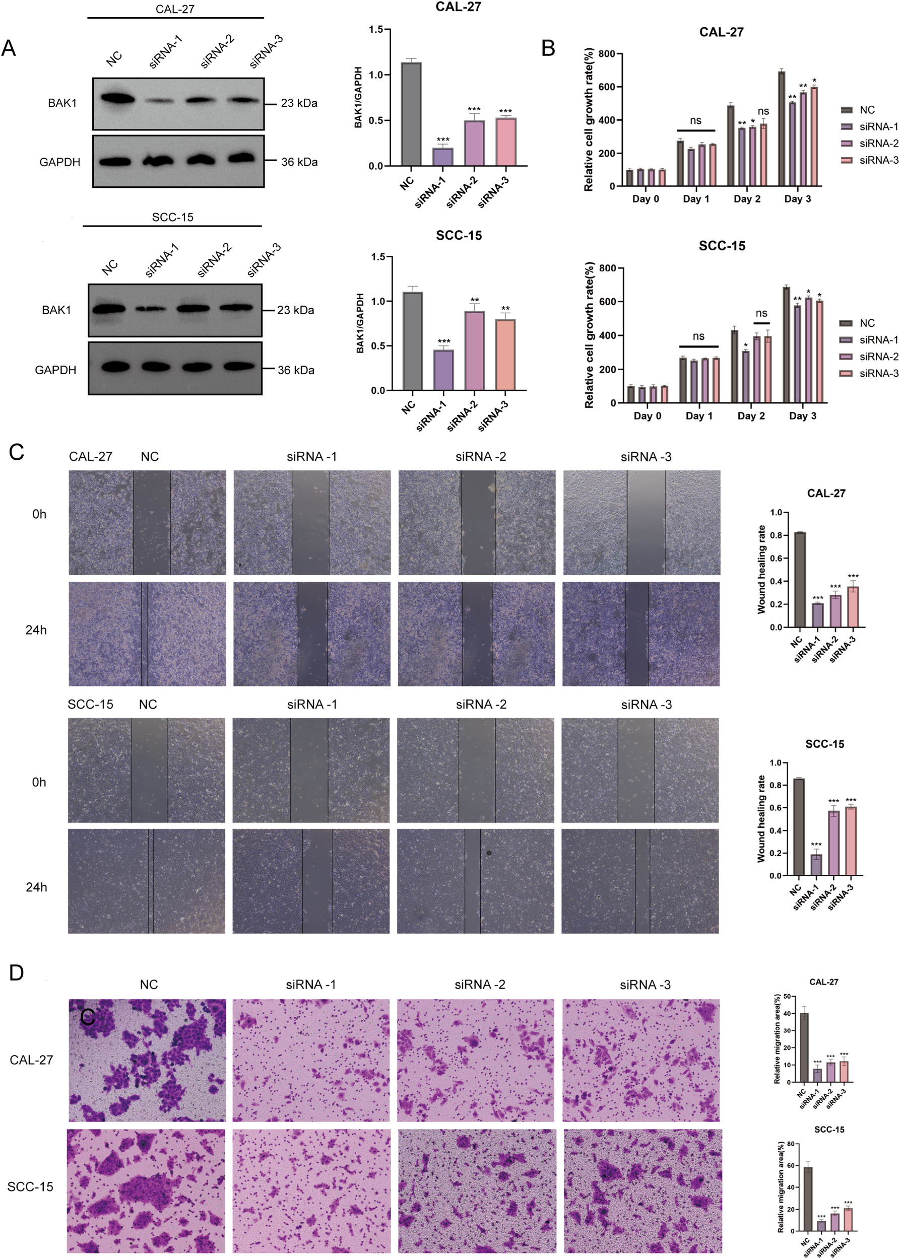 (A) Western Blot analysis demonstrated significant knockdown efficiency of BAK1 in CAL-27 and SCC-15 cell lines. (B) CCK-8 assays revealed reduced proliferation rates in BAK1-knockdown cells compared to the negative control (NC) group. (C, D) Wound healing and Transwell assays confirmed markedly impaired migration and invasion capabilities in BAK1-knockdown OSCC cells. The NC group (negative control) was transfected with non-specific siRNA using transfection reagents. All experiments were conducted in three independent replicates. Asterisks indicate statistical significance: *P < 0.05; **P < 0.01; ***P < 0.001. “ns” denotes not significant.