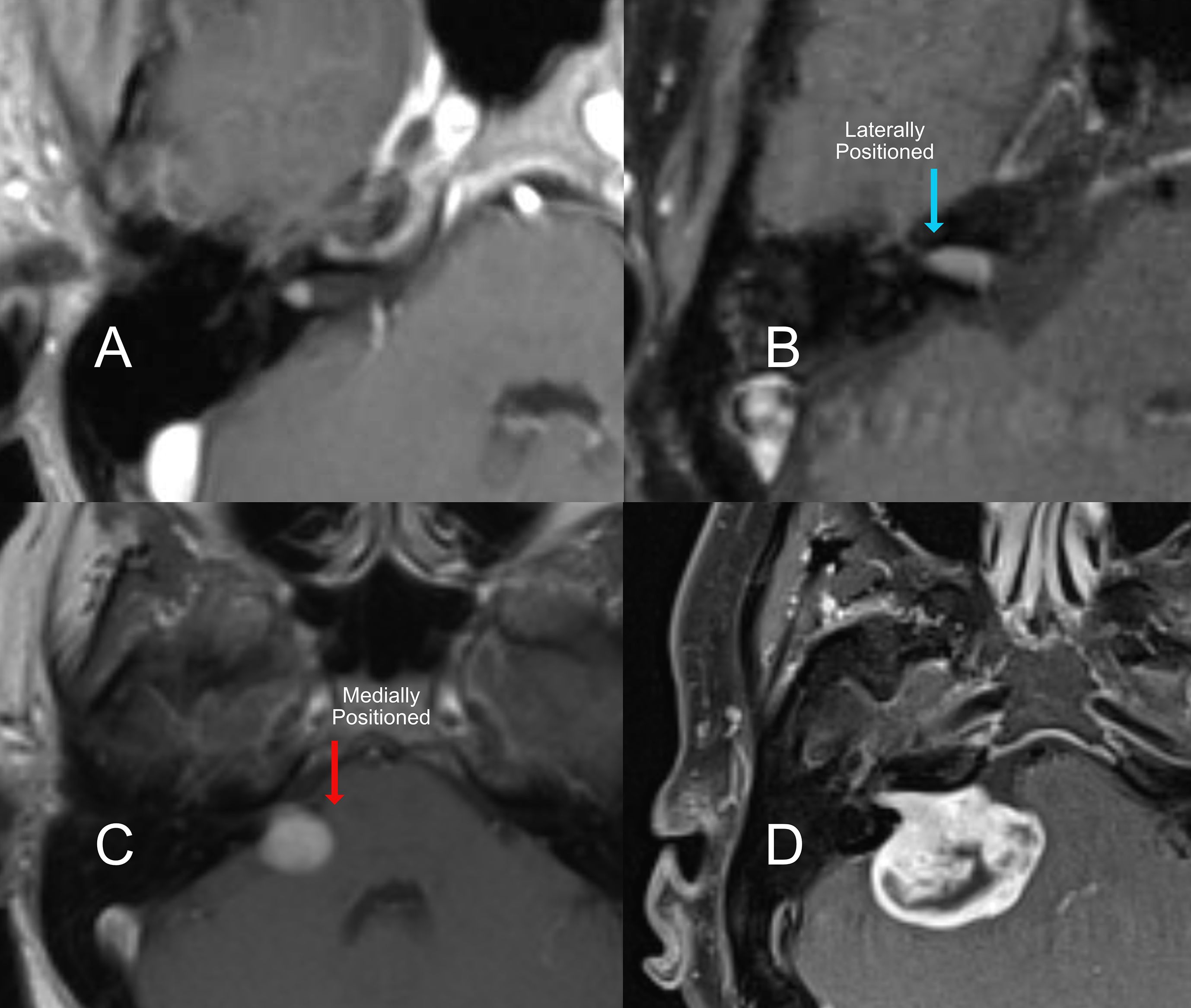 Figure 1. T1 Contrast MRI of an acoustic neuroma with different locations relative to internal auditory canal. (A) a very small intracanalicular tumor, (B) a laterally positioned tumor filling the auditory canal, (C) medium tumor medially positioned to the internal acoustic canal, and a large tumor (D) with brainstem compression.
