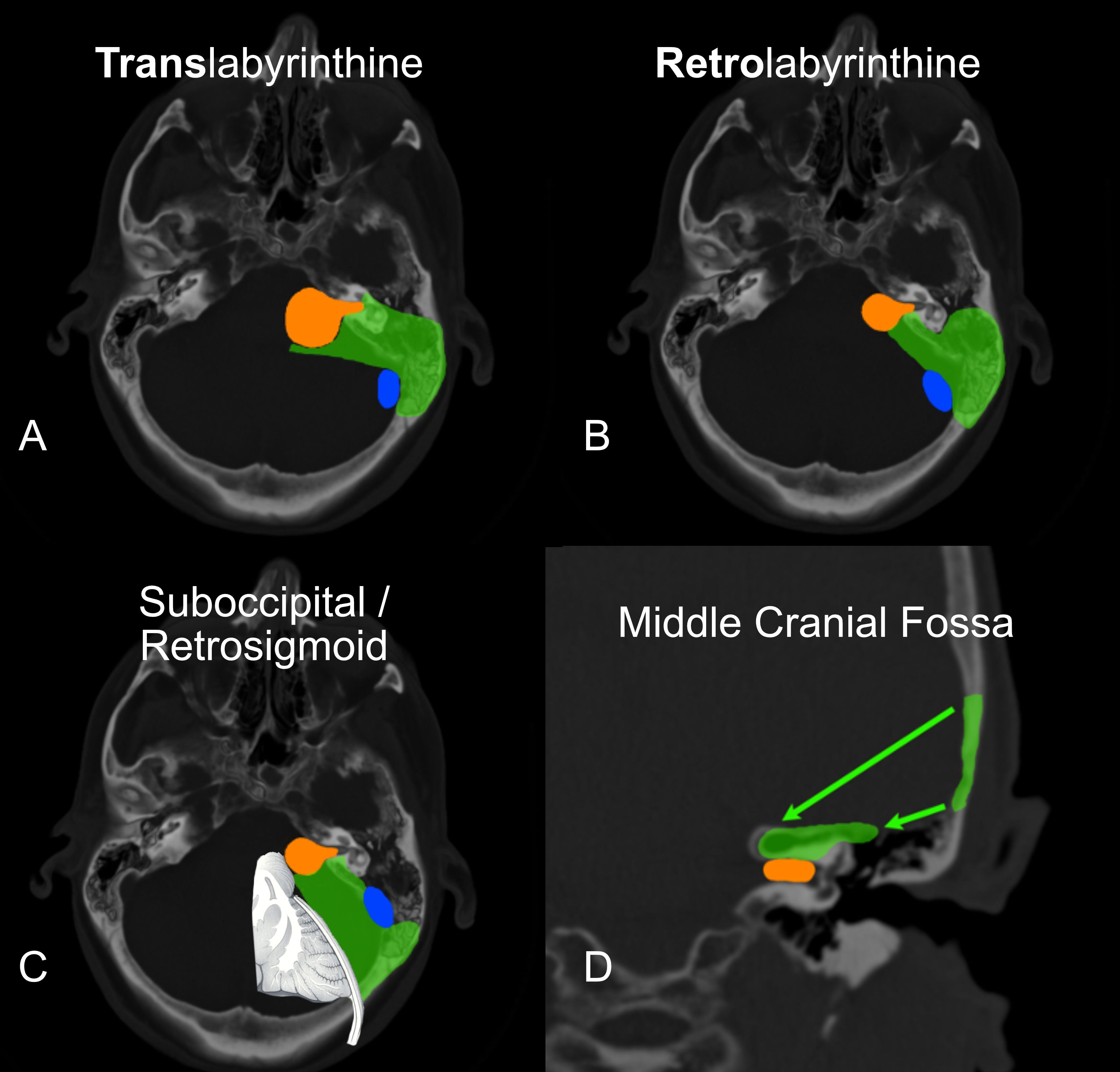 Figure 2. The transtemporal approaches are diagrammed in: (A) Translabyrinthine & (B) Retrolabyrinthine hearing preservation variants. The Suboccipital/Retrosigmoid approach is seen in (C) (Note the significant brain retraction required with this approach). The middle cranial fossa is diagrammed in (D). In all panels, the green delineates the bone removed and the view to the tumor. The tumor is in orange. The sigmoid sinus is in blue.