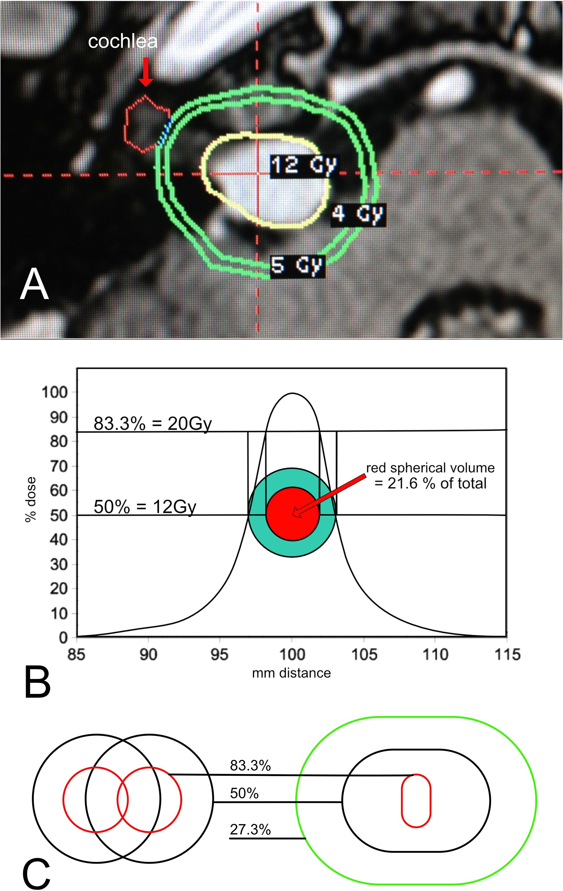 It is important to understand the radiation dose curves. If the tumor were a perfect sphere, it could be fully surrounded by the radiation sources, making the treatment plan simple. It would only require a single shot to cover the entire volume with radiation. A single shot has an optimum dose curve when the dose at the edge of the tumor is placed at exactly the 50% line. Figure 3B shows a dose curve for a single shot in a cross-sectional plane. Plans use 50% most often because this is where the spread of dose away from that point is minimized, corresponding to the steepest position on the curve. It also means that the maximal dose at the very center of the tumor (100%) is twice the dose at the edge (50%). This is desired, as the higher dose is limited to the center of the tumor, furthest away from surrounding structures. Figure 3B shows a theoretical y-axis dose curve from a single 4mm shot. With an edge dose of 12Gy conforming to the 50% dose line, 20Gy will fall at the 83.3% line. Why 20Gy? Because laboratory studies have been shown it to be the minimum lethal dose to human acoustic neuroma cells. If the green circle is the tumor edge, the red circle is the 20Gy line. Translating these circles into perfect spheres, the red center would contain 21.6% of the total green tumor volume. For this theoretical dose curve, 78.4% of the tumor volume would not receive a lethal dose. However, in practice, it is not so simple. The dose curves are not symmetric because the radiation cannot be delivered from below the head, as the body is in the way. Additionally, the source of radiation cannot be positioned below the tumor, as the head is connected to the body, and the body must enter the device from this angle. This skews the geometry of each shot. Furthermore, the tumor is not a perfect sphere. Multiple shots are given to conform the dose to the actual shape. When more than one shot is given, the phenomenon of “normalization” affects the dose curve by flattening the slope, effectively reducing the volume of the higher doses (48) (Figure 3C). Figure 3C demonstrates the effects of normalization clearly, showing that the center dose is dramatically reduced in volume when more than one shot is placed to cover the edge. Various methods exist to minimize the impact of normalization, but none can achieve a distribution similar to the ideal single shot.