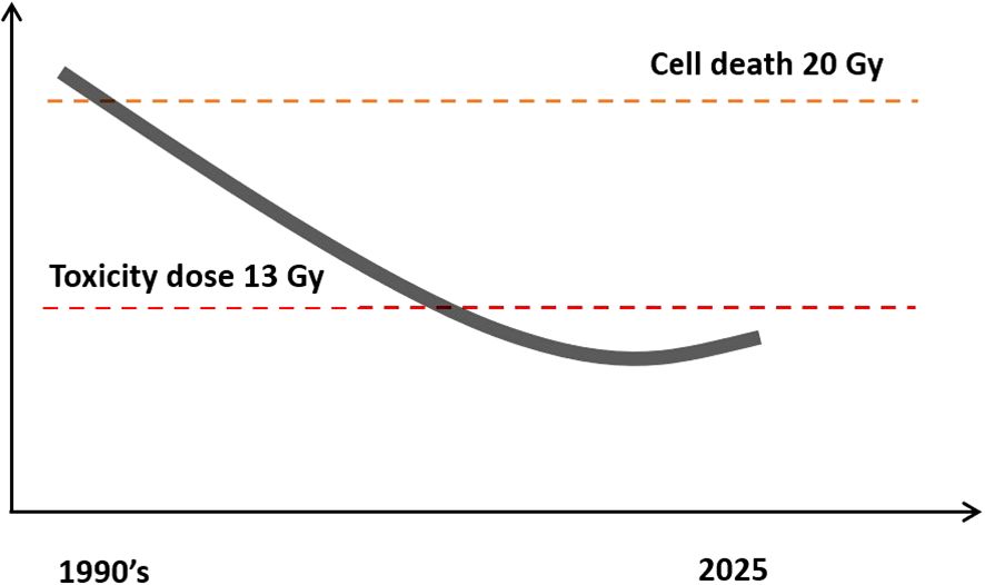 Figure 4. Trend of Gamma Knife® treatment dose over time. Most centers today use doses under 13Gy because higher doses were found to be associated with excess radiation toxicity. The graph represents the trend of the treatment dose over time.