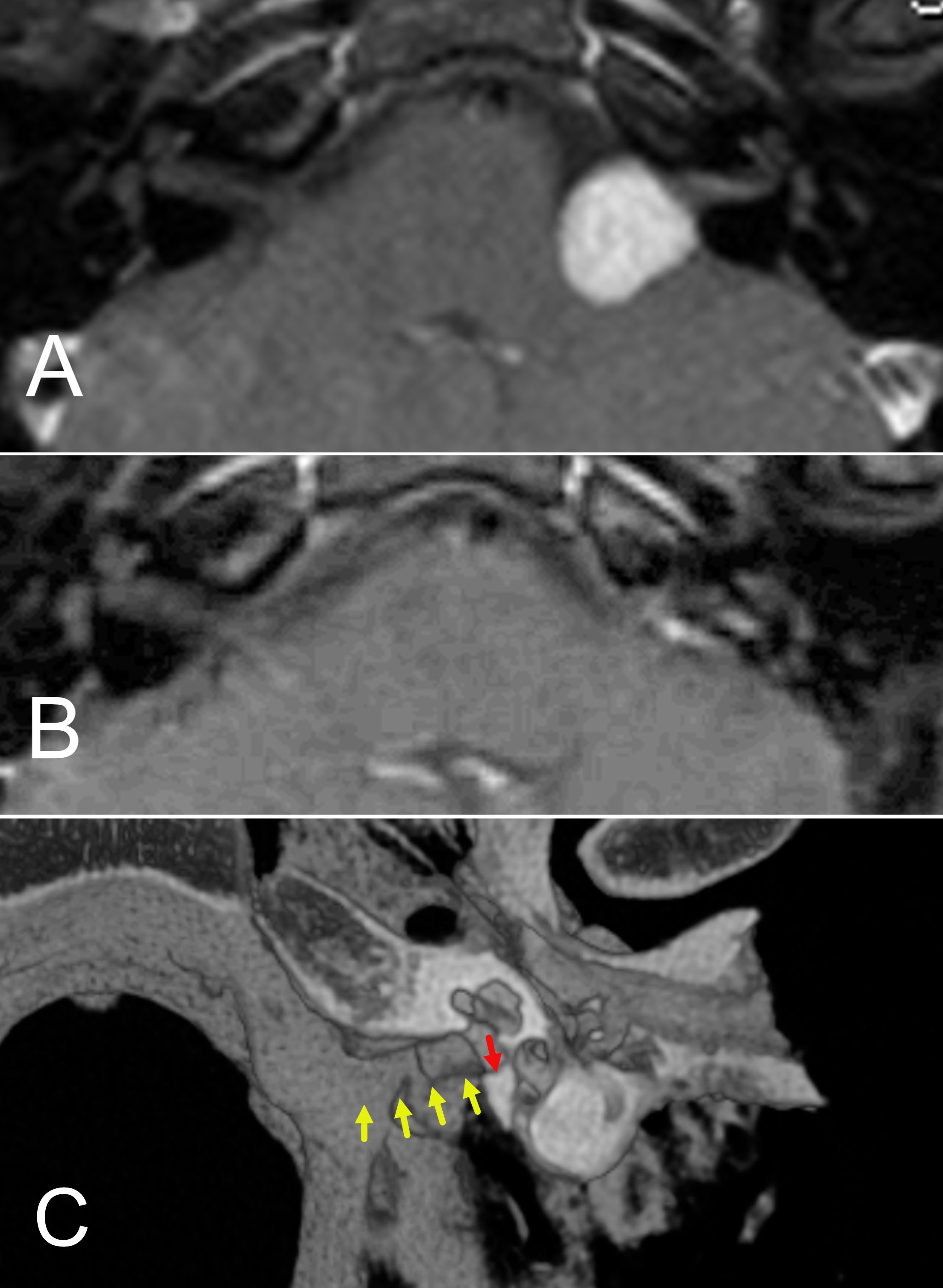 Figure 5. (A, B) Preoperative (A) and postoperative (B) MRI of a patient who underwent retrolabyrinthine hearing preservation of an acoustic neuroma. (C) 3D reconstruction of post operative CT scan for the patient operated by the retrolabyrinthine approach. The yellow arrows show the degree of internal auditory canal bone removal. The red arrow shows the final portion of bone that remained. At least 4/5 of the length of the internal canal can be removed and the inner ear structures retained.