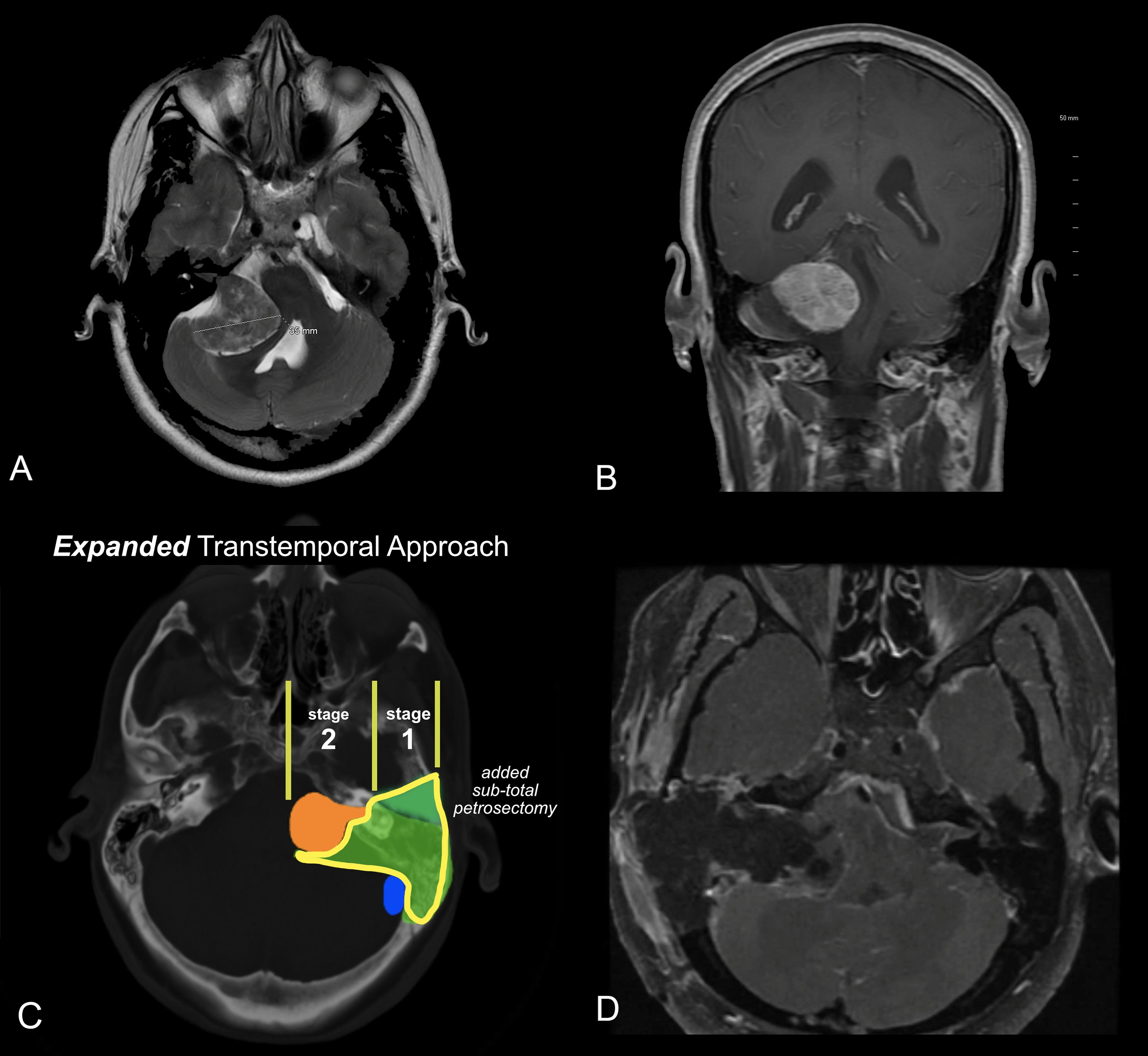 Figure 6. (A, B) MRI of a patient with a very large acoustic neuroma. (A) T2 axial MRI. (B) T1 C+ coronal MRI. (C) Expanded Transtemporal Approach. The green segment, lower portion, is the same as the translabyrinthine resection. The upper green segment is the additional bone removed from the subtotal petrosectomy. The lateral bone removal can easily be performed as a separate stage from the tumor removal to optimize safety and outcomes. (D) Post-operative MRI revealing gross total removal by the expanded transtemporal approach.