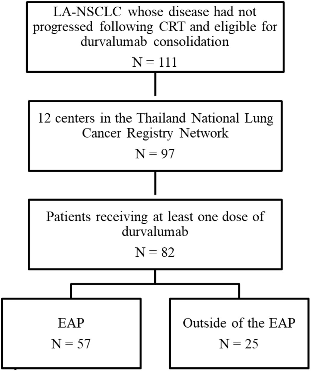A multicenter, observational, retrospective study was conducted on patients with unresectable stage III NSCLC who were treated with definitive chemoradiation and were eligible for consolidation therapy with durvalumab, either as part of the EAP in Thailand or outside the EAP. A total of 82 patients from 12 centers were enrolled between January 1, 2021, and August 31, 2022. Data for this study were extracted from patients’ medical records and entered into electronic case report forms (eCRFs) within the Thailand National Lung Cancer Registry Database.