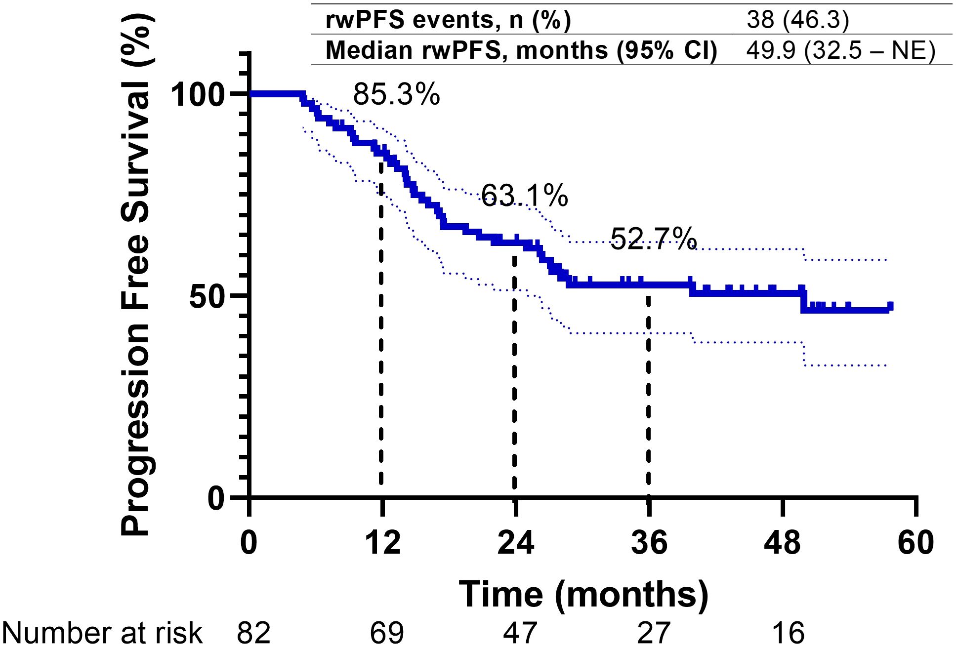 Post-hoc power calculations were performed to assess the adequacy of our sample size for detecting clinically meaningful differences in the primary endpoint of PFS using G*Power 3.1.9.7 and the R package “powerSurvEpi”. Our sample size was 82 patients, and the observed median PFS was 40.1 months (from durvalumab initiation). Assumed clinically meaningful hazard ratio was 0.7, alpha level was 0.05 (two-sided), and expected event rate based on observed was 46.3% progression events; therefore, the calculated power was 85.2% for detecting HR ≤ 0.7.