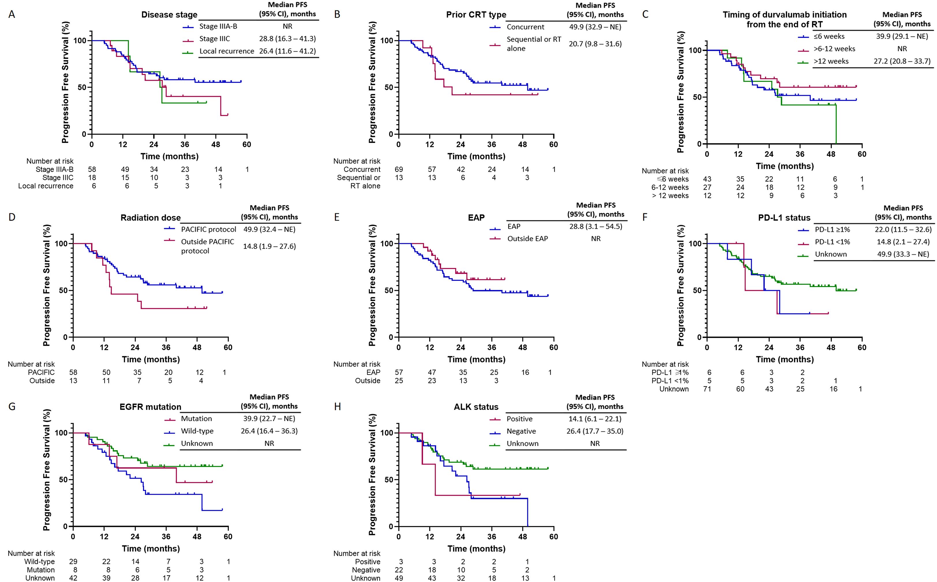 Upon a median follow-up period of 43.3 months (95% CI, 38.8–47.8) from diagnosis, disease progression was observed in 38 patients (46.3%), and 22 patients (26.8%) had died. The median PFS for the overall study cohort was 49.9 months (95% CI, 32.5 to NE). The 1-year and 2-year PFS rates were 85.3% (95% CI, 77.1%–93.5%) and 63.1% (95% CI, 52.4%–73.8%), respectively (Figure 2). PFS was longer in patients with a good PS (0–1) compared to those with a poor PS (≥2), and their median PFS was 49.9 and 26.2 months, respectively. Additionally, patients with stage IIIA/B disease exhibited longer median PFS (not reached) compared to those with stage IIIC disease (28.8 months) and local recurrence (26.4 months). Patients who received cCRT demonstrated a longer median PFS than those who received sequential CRT (sCRT) or RT alone, and their median PFS was 49.9 and 20.7 months, respectively. Moreover, patients who received radiation doses in accordance with the PACIFIC protocol exhibited an extended median PFS (49.9 months) compared to those who were outside the PACIFIC protocol (14.8 months). In contrast, the timing of durvalumab initiation from the end of RT did not significantly impact PFS. Patients who initiated treatment within 6 weeks, as recommended by the PACIFIC protocol, demonstrated a median PFS of 39.9 months. Those who initiated treatment beyond 6 to 12 weeks exhibited a median PFS that was not reached, while patients who initiated treatment after more than 12 weeks from RT had a median PFS of 27.2 months. Similarly, no substantial difference in PFS was observed between patients enrolled in the EAP and those treated outside of the EAP, and their median PFS was 28.8 months and not reached, respectively. Regarding PD-L1 expression, patients with a PD-L1 TPS of ≥1% had a median PFS of 22 months (95% CI, 11.5–32.6), while those with a TPS < 1% had a median PFS of 14.8 months (95% CI, 2.1–27.4) (p = 0.71). Although no statistically significant differences in PFS were detected between patients with EGFR mutations (EGFRm) and wild-type EGFR (EGFRwt), the median PFS was 39.9 months (95% CI, 22.7 to NE) for EGFRm and 26.4 months (95% CI, 16.4–36.3) for EGFRwt (p = 0.32). Conversely, patients with ALK rearrangement exhibited shorter PFS compared to those without ALK rearrangement, and their median PFS was 14.1 and 26.4 months, respectively (Figures 3A–H) (Table 3).