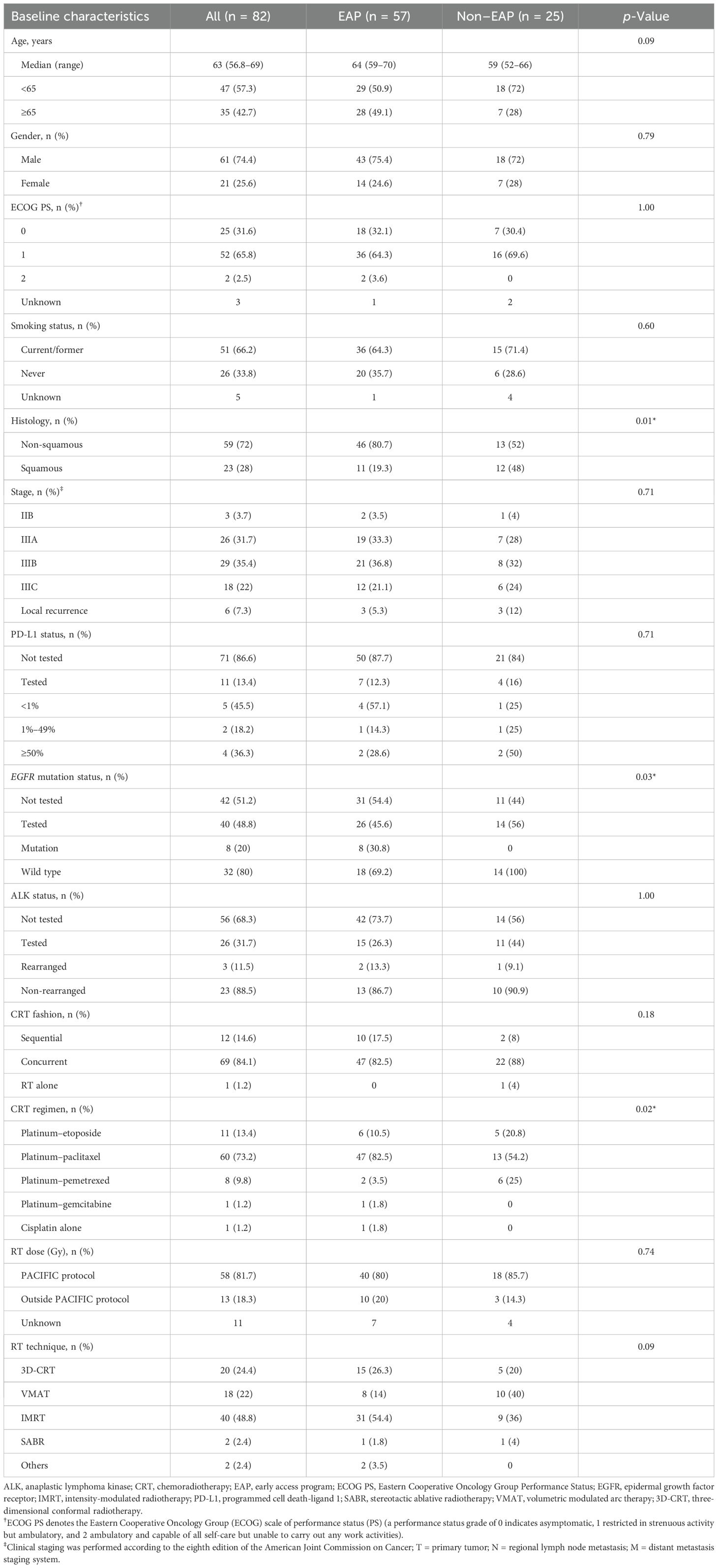 Patient populations differed substantially between EAP and non-EAP cohorts. EAP patients demonstrated inferior baseline characteristics, including poorer performance status, higher prevalence of stage IIIB/C disease, and greater use of sequential rather than concurrent chemoradiotherapy. Additionally, EAP patients experienced longer delays between radiotherapy completion and durvalumab initiation, often receiving suboptimal radiation doses. These differences reflected the inherent selection bias in EAP populations, which typically include patients with more advanced disease and broader eligibility criteria than those enrolled in pivotal trials (13, 16). Notably, 55.3% of our real-world cohort did not meet strict PACIFIC study inclusion criteria, highlighting the clinical reality of expanded access programs. Stratification by access program type is, therefore, methodologically essential to control for selection bias, lead-time bias, and confounding by indication, enabling differentiation between population-driven and treatment-driven outcome differences.