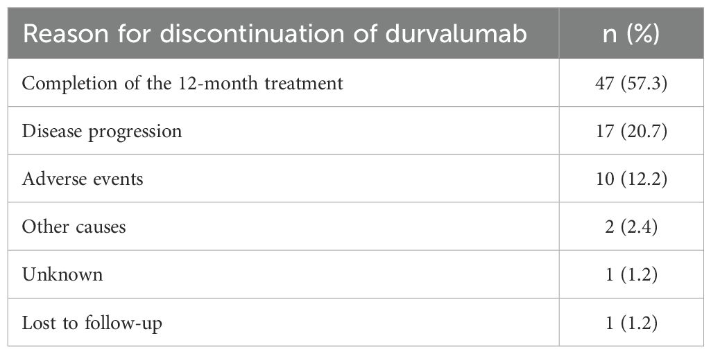 Fifty-two percent of patients adhered to the PACIFIC protocol by initiating durvalumab treatment within 42 days after completing radiotherapy (RT). The median duration between the end of RT and the start of durvalumab was 41.5 days (range 1–215). However, it is noteworthy that a subset of patients deviated from this recommended timeframe. Specifically, 27 patients (33%) commenced immunotherapy more than 6 weeks but less than 12 weeks, while 12 patients (14.6%) initiated durvalumab treatment after 12 weeks had elapsed since the completion of RT. Among the 75 patients with evaluable disease, the ORR and DCR were 41.3% and 86.7%, respectively. This consisted of complete response in five patients (6.7%), PR in 26 patients (34.7%), SD in 34 patients (45.3%), and progressive disease (PD) in 10 patients (13.3%). The median DoR was 31.8 months [95% CI, 22.9 to not estimated (NE)]. As of the data cut-off on December 31, 2022, four out of 82 patients (4.9%) remained on durvalumab treatment. In total, 47 patients (57%) successfully completed the 12-month treatment course with a median of 24 cycles (range 1–26), and the median duration of treatment was 11.4 months (range 0–20.2). Disease progression was the most common reason for the discontinuation of durvalumab, accounting for 17 cases (20.7%), followed by immune-related adverse events (irAEs) leading to discontinuation in 10 cases (12.2%) (Table 2).