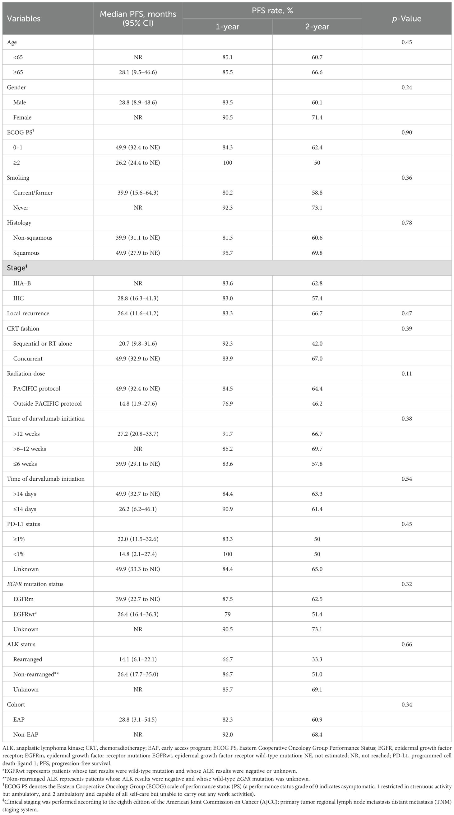 With a median follow-up of 43.3 months from diagnosis, the 2-year PFS was 63.1%. From durvalumab initiation, the 2-year PFS was 52.9%. Despite considerable differences from the phase III PACIFIC trial regarding baseline characteristics and treatment strategies, our real-world cohort demonstrated meaningful clinical outcomes.