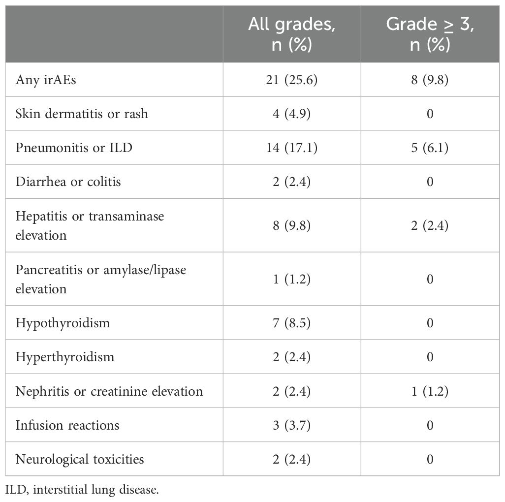 Adverse events related to immune-related toxicities were documented in a significant proportion of patients in our study. Out of the total patient cohort, 21 patients (25.6%) experienced irAEs of any grade, while eight patients (9.8%) encountered irAEs of grade 3 or higher severity. Pneumonitis emerged as the most prevalent irAE, affecting 14 patients (17%), with five cases (6%) reaching grade 3 or higher. Consequently, the occurrence of pneumonitis necessitated treatment discontinuation for six patients (7.3%), and one patient (1.2%) experienced fatal pneumonitis events. However, before initiating durvalumab treatment, 14 patients had already developed radiation pneumonitis. Among them, five patients subsequently developed pneumonitis. Additionally, other commonly reported irAEs included hepatitis or transaminase elevation (9.8%) and hypothyroidism (8.5%). These adverse events led to the permanent discontinuation of treatment in 2.4% and 0% of patients, respectively (Table 4). PFS among patients who discontinued treatment due to irAEs exhibited outcomes consistent with the overall study population. The median PFS in this subgroup was 20.7 months (95% CI, 2.2–39.1). Furthermore, the 1-year and 2-year PFS rates were 88% and 65.9%, respectively (Figure 5).