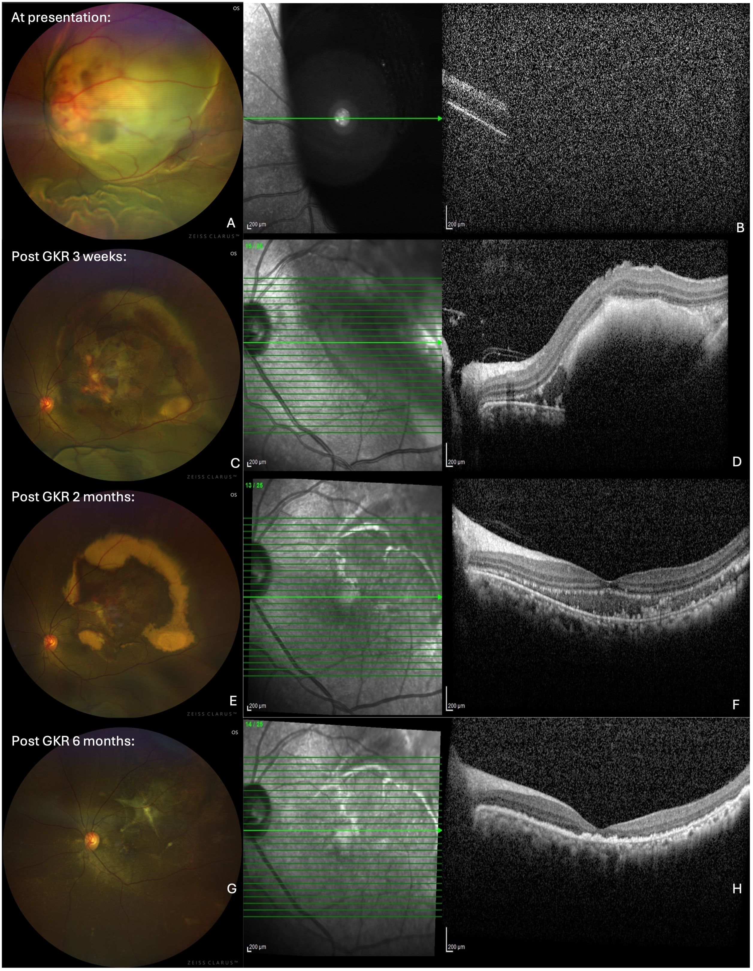 Figure 1. Wide-field fundus photographs (left column) and optical coherence tomography (OCT) imaging (right coloumn) showing left eye choroidal mass. (A) At presentation: subretinal mass in the papillomacular bundle, with associated subretinal haemorrhages and extensive serous detachment extending from 11 to 4 o’clock. (B) At presentation: OCT did not show useful information as the retinal lesion extended beyond the window capturable by the machine. (C) Post GKR 3 weeks: significant reduction in the size of the choroidal mass and exudative retinal detachment. (D) Post GKR 2 months: Further decrease in the size of subretinal convexity and adjacent subretinal fluid, with persistent hyperreflective foci in the outer retinal layers correlating with the hard exudates. (E) Post GKR 2 months: Reduced size of choroidal mass, with areas of hard exudations and residual subretinal hemorrhage. (F) Post GKR 2 months: Further decrease in the size of subretinal convexity and adjacent subretinal fluid, with persistent hyperreflective foci in the outer retinal layers correlating with the hard exudates. (G) Post GKR 6 months: Completely resolved choroidal mass and retinal detachment. (H) Post GKR 6 months: Resolution of the choroidal lesion and adjacent subretinal fluid, with areas of hyperreflective foci and irregularities observed at the RPE level, loss of ellipsoid zone and reduced subfoveal thickness.