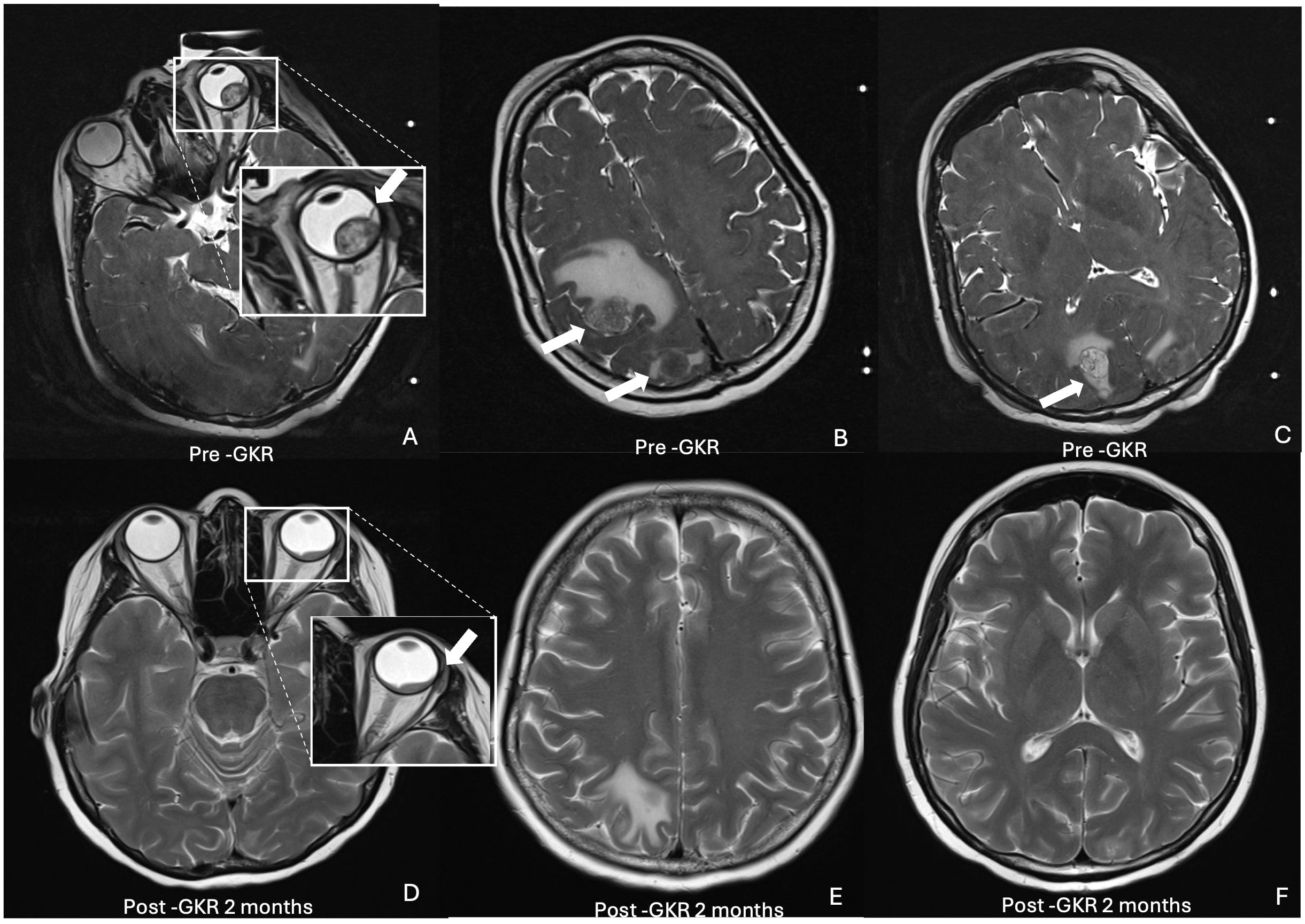 Figure 2. Axial T2-weighted MRI brain and orbit showing choroidal and multiple intracranial metastatic lesions pre (top row) and post GKR 2 months (bottom row). (A) inset. Intraocular mass (arrow) at superolateral left globe. (B) Metastatic nodules with prelesional oedema (arrows) at right parietal and occipital lobes (C) Metastatic nodule (arrow) at right occipital lobe. (D) inset. Reduced size of intraocular mass (arrow). (E) Reduced and resolved intracranial nodules at right parietal and occipital lobes. (F) Resolved nodules at occipital lobe.